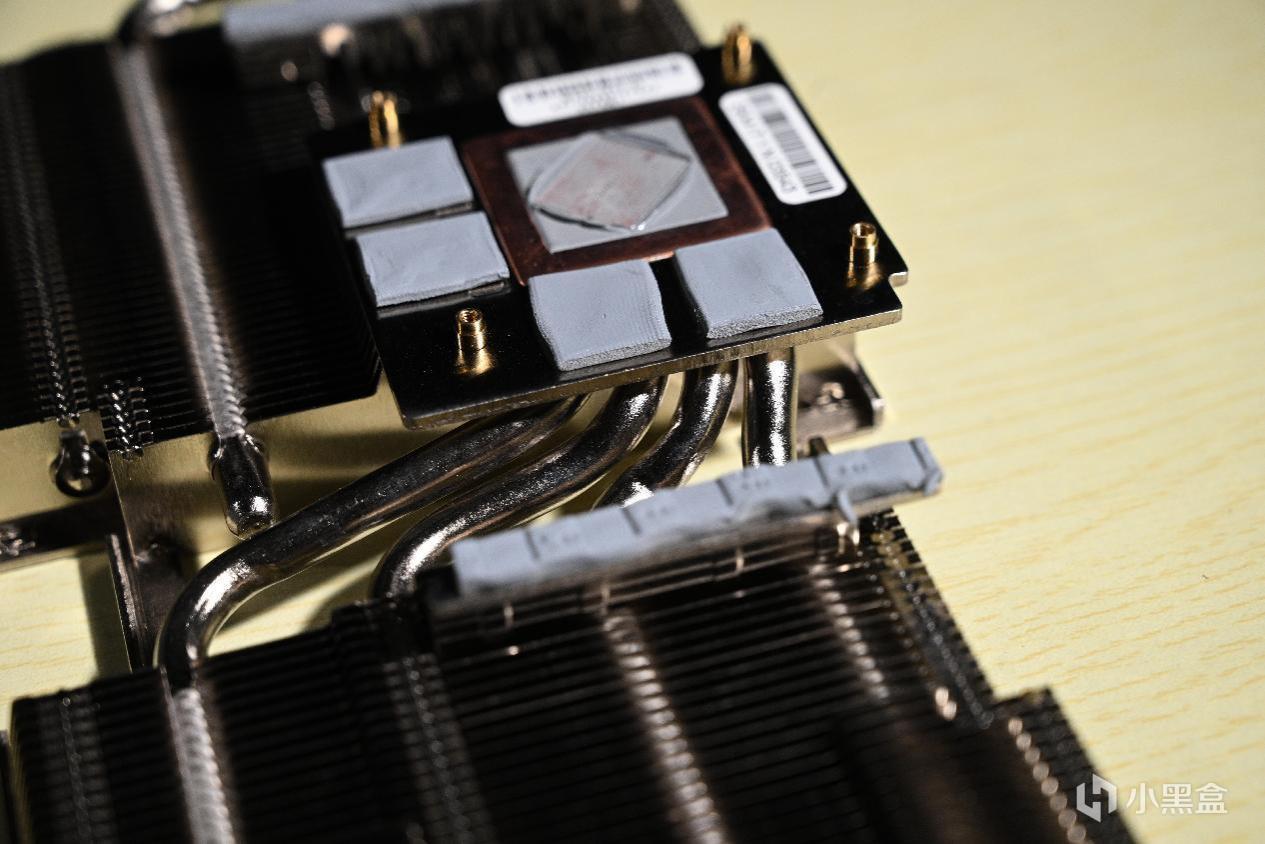 散热底座为金属铜底独立底座,GDDR6显存通过散热垫衔接镀镍底座,热管为4x6mm镀镍热管,散热模组两端MOS管均被散热垫覆盖。