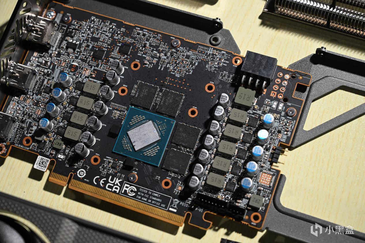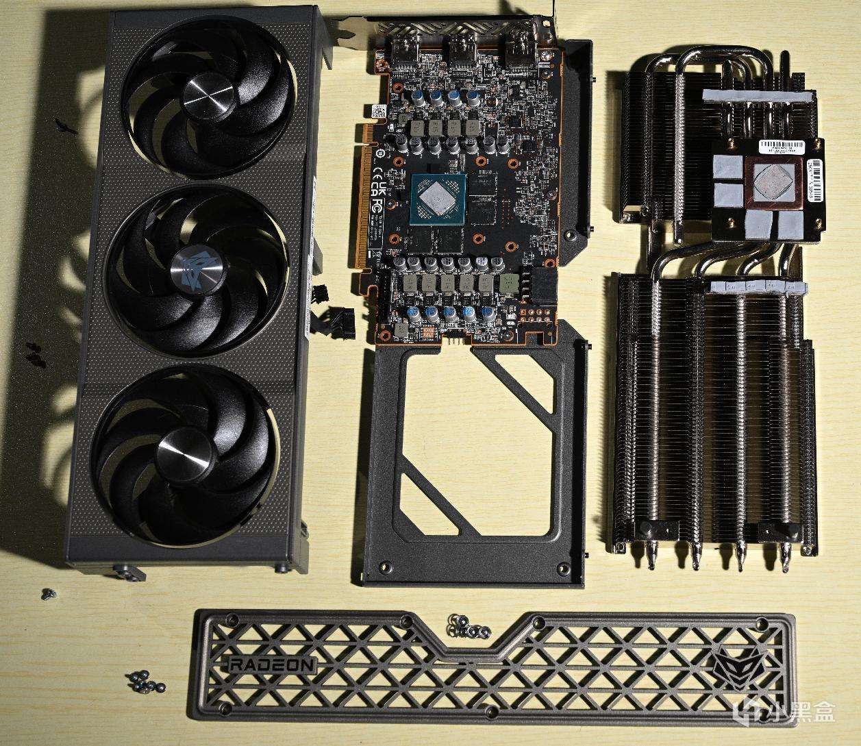 将显卡进行拆解后,我们能看到风扇模块、PCB模块和导热模块三大部分。PCB被金属背板与风扇支架固定在一体式显卡框架内,通过金属底座、热管、鳍片进行散热循环。