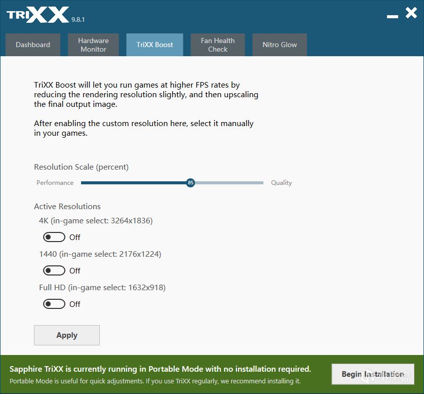 此外,蓝宝石还开发了一个精细化分辨率控制功能TriXX BOOST,因为不同玩家的视觉其实对画面清晰度有不同理解,比如说我对2K下80%渲染分辨率的画面是完全可以接受的,那么通过这个软件降低渲染分辨率再锐化输出,这样玩家相当于获得了画面体验-10分但是帧数体验+15分的效果。