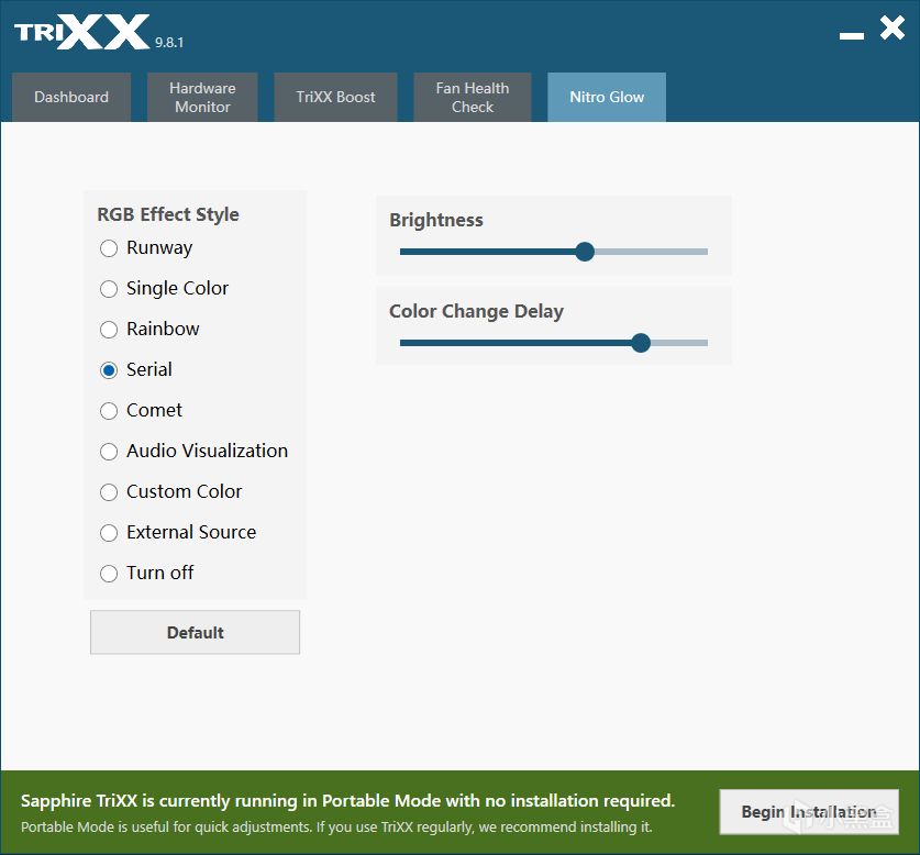 很多玩家在装机后都会进行灯效的调试,蓝宝石作为AMD一线大厂自然也有研发自己的灯效控制软件TRIXX,从蓝宝石官方网站上即可获得。