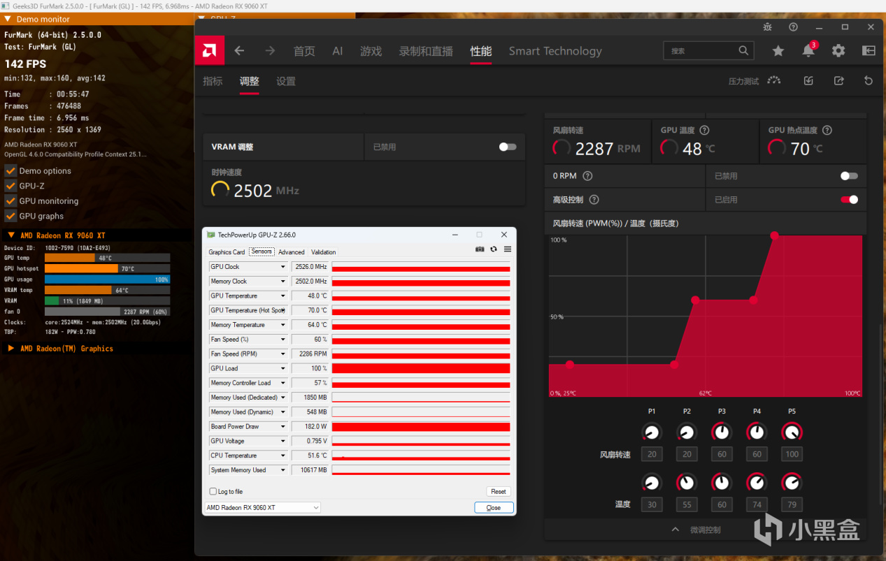 通过驱动当中大红调整风扇策略,当风扇速度设置为60%,2300转左右时,热点温度下降至70度,显存温度更是下降14度,维持在64度。噪音表现上,仍然不足45Db,因此,强烈建议机箱风道不够通透或者对运行温度有顾虑、怕影响运行稳定性的同志们在夏天里主动调整风扇策略。
