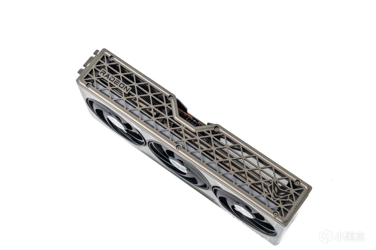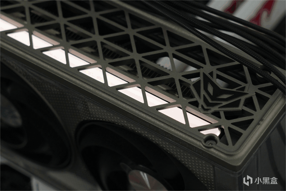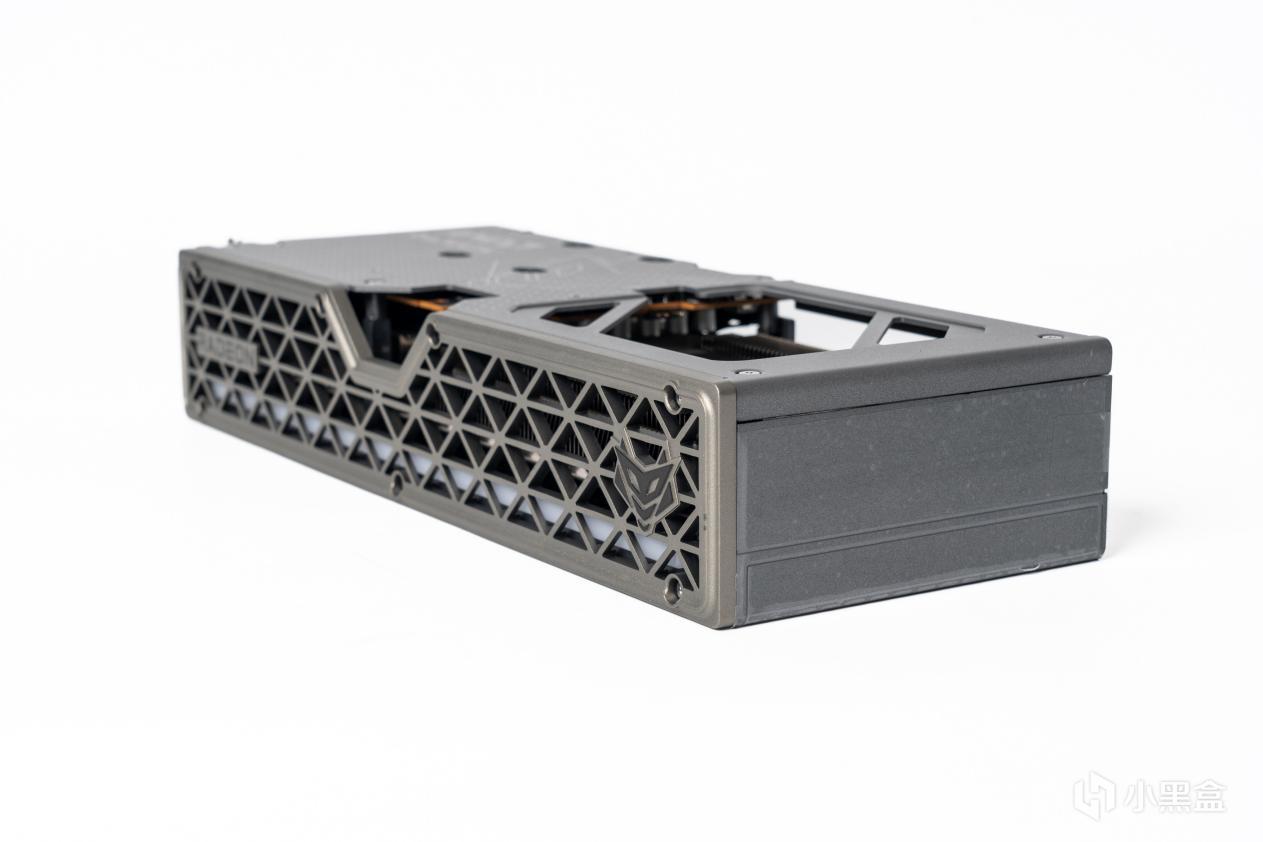 网状的三角形菱格装饰网是一个通过螺丝固定的塑料件,RADEON和品牌LOGO分置两侧。中间为8Pin供电接口留出了空间。指望官方出新的肯定是没戏了,不知道有没有3D 打印大佬能出个不挡灯条的护罩版本。