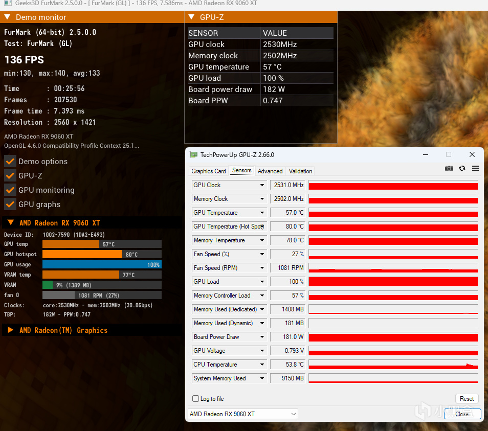 规格上:2048个流处理器,加速频率3320MHz,游戏频率2780MHz,128bit 16GB显存,显存速率20Gbps。相较公版参数3.23GHz,氮动OC版本加速频率超过3.3Ghz,在非公版本的RX9060XT中也是名列前茅的。