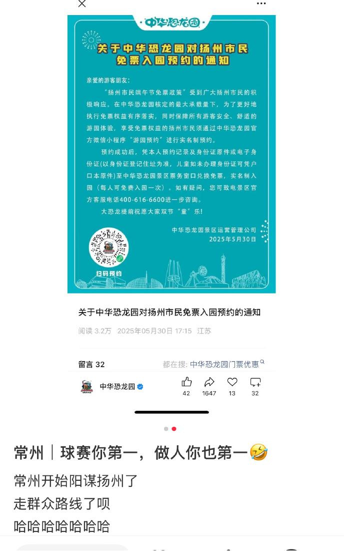 关键是,就这样我们还得装成很没有脾气的样子。在还没和扬州踢比赛前,常州就单向对其签订了丧市辱民的《景点无偿开放条约》,允许扬州市民免费游玩常州的A级旅游景区。反观扬州呢,虽然也开放了部分景点对常州人免费,但并不包括最有名的瘦西湖,你就说这条约签得平等不平等吧。而且一想到我前几周刚和朋友花260元的门票去了趟常州恐龙园,现在我都觉得自己的心在滴血。