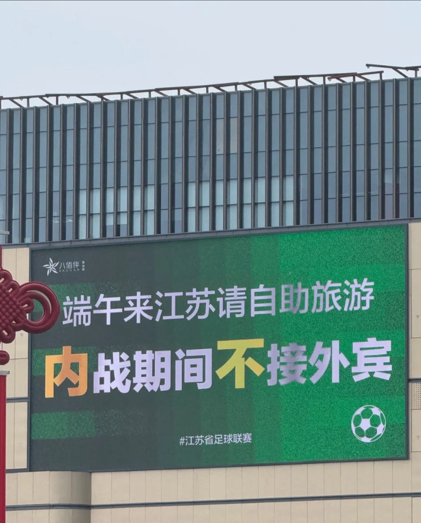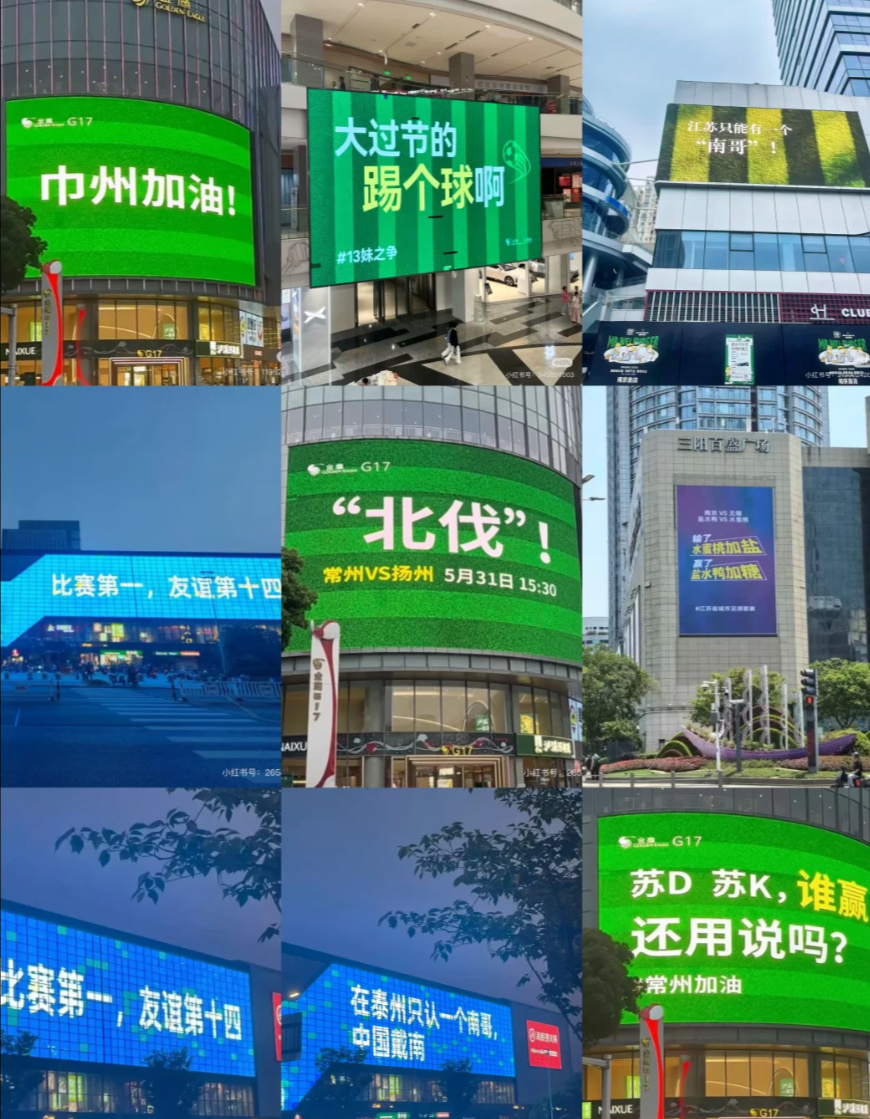 不过,相比用AI做海报互相较劲,各个城市商场里的巨型广告屏,其实才是苏超爆火后战火最密集的地方。
