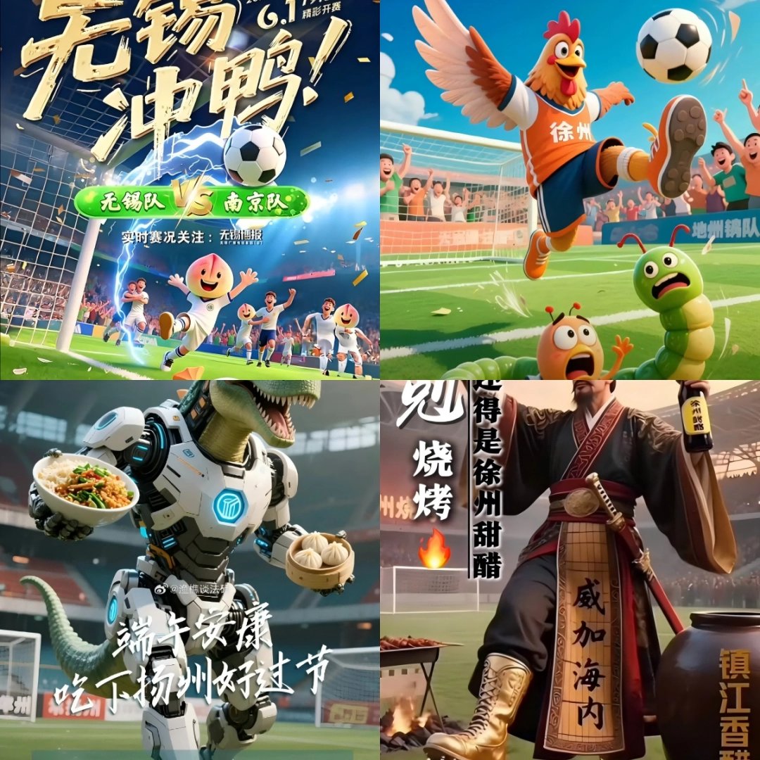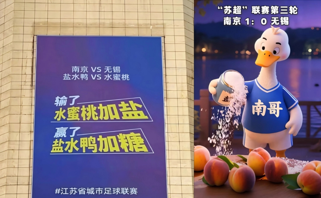 比如,南京对战无锡,不光是苏A大战苏B,还是盐水鸭大战水蜜桃。赛前有无锡商场率先亮出口号“输了水蜜桃加盐,赢了盐水鸭加糖”,结果赛后南京1:0战胜无锡,南京网友们很快就用AI做出了盐水鸭在水蜜桃上撒盐的动画,予以还击。