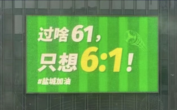 比如盐城对战淮安的时候,正好是六一儿童节,于是当地商场里便出现了“过啥六一,只想6:1”的口号。