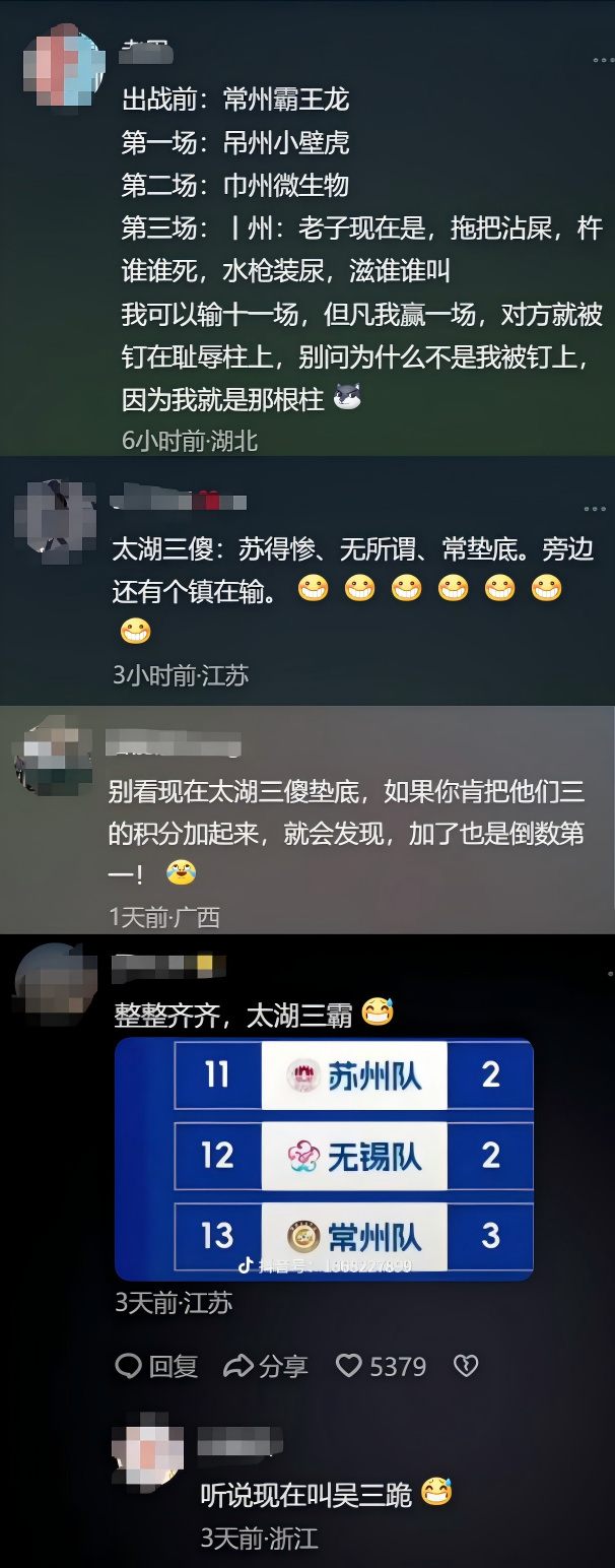 不过,好消息是,常州边上的无锡和苏州,现在的情况也没比我们好到哪去。以前外人见到咱仨都得夸一句苏南经济龙头、太湖三霸,现在因为球赛排名垫底,三霸一起沦落成太湖三傻,只能说不愧是兄弟城市,确实够义气。