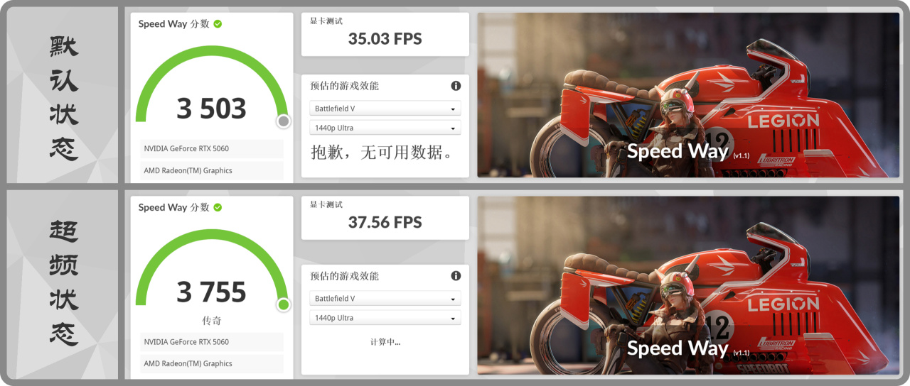 ▼ 首先使用3DMark的Speed Way測試,以默認狀態得分爲3503,超頻狀態得分爲3755,超頻後性能提高了7.2%。
