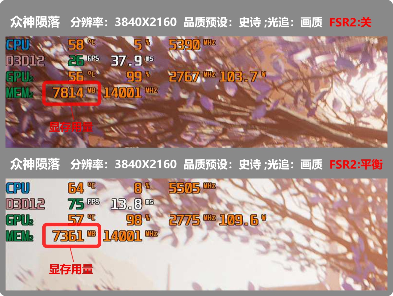 ▼截取了《衆神隕落》的畫面,DLSS(FSR)確實可以降低一定的顯存用量,但還是出現幀數明顯低於RTX4060Ti 的現象。雖然RTX5060的RT和TC核心數量要少於RTX4060Ti ,但畢竟性能提升了,應該不至於會明顯落後於RTX4060Ti ,也只能推論是有些遊戲優化沒有到位!