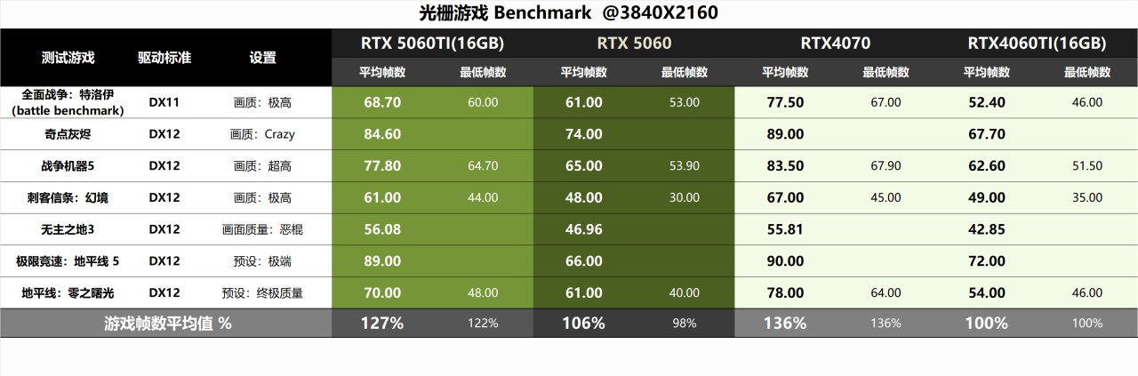 ▼4k分辨率,還是那2款遊戲明顯低於RTX4060Ti ,去除這2款遊戲,RTX5060可以反超RTX4060Ti 。