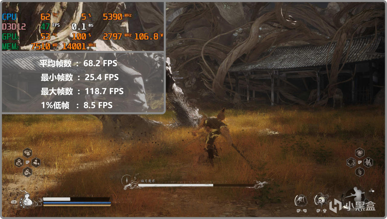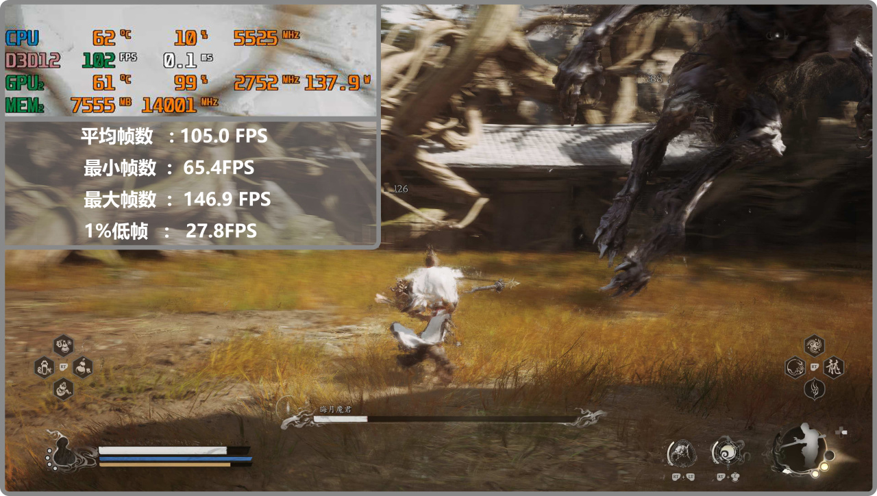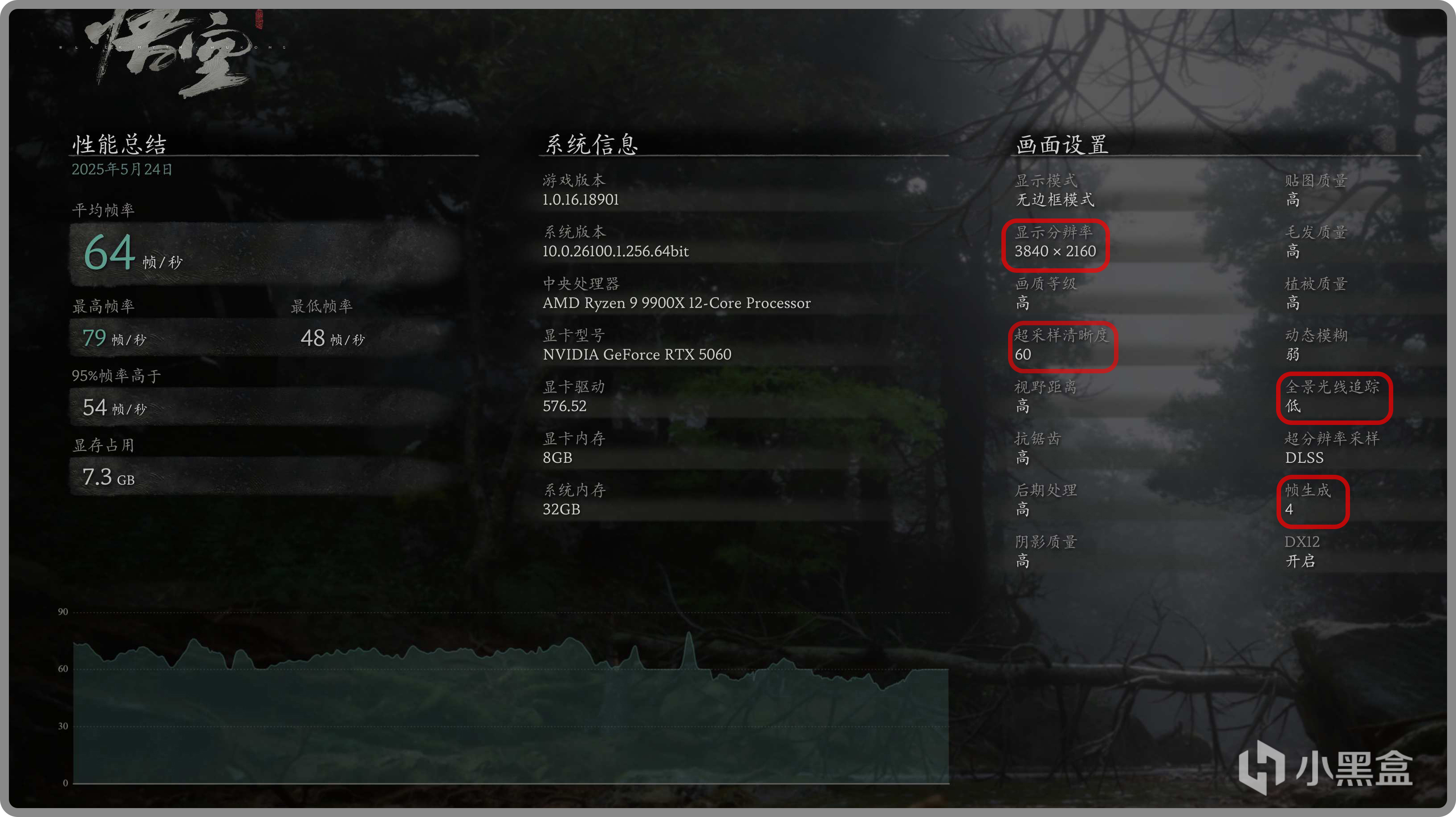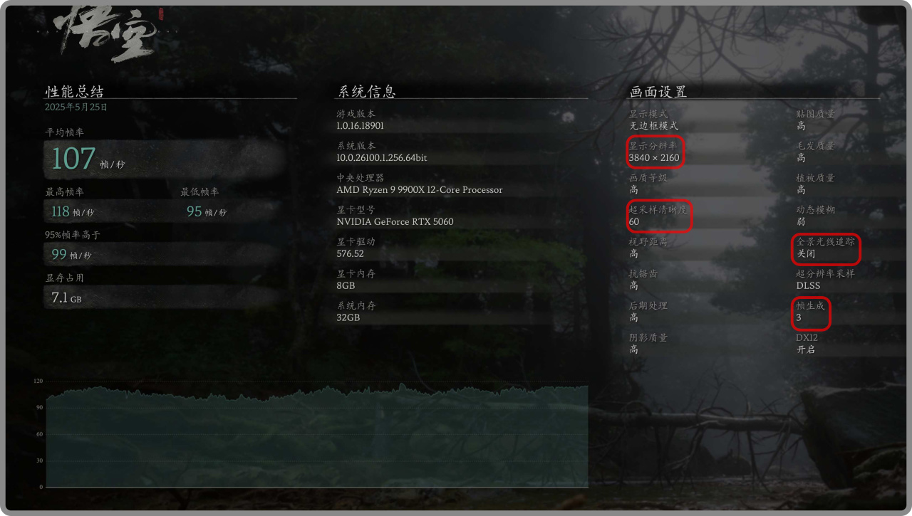 ▼4k分辨率確實是難爲RTX5060了,但也嘗試測試了下。畫質:高+全景光追:低,《黑神話》通過FGX4+DLSS平衡,平均幀數能達到60fps以上。可以看到顯存用量爲7.3GB,未爆顯存。