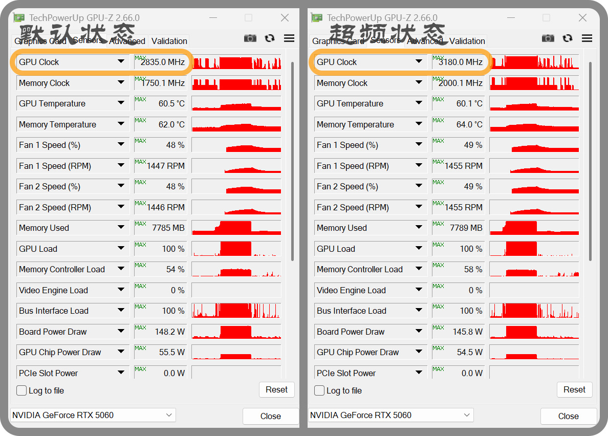 ▼使用GPUZ記錄了測試過程:默認狀態最高頻率達到了2835MHz,超頻狀態最高頻率達到了3180MHz。而功耗,溫度,甚至是風扇轉速,兩者相差都不大。