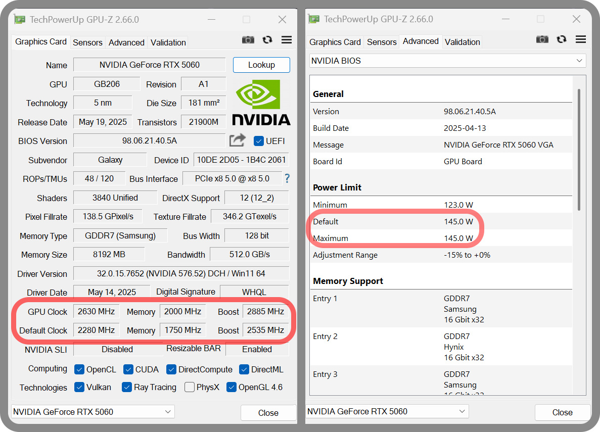 ▼ RTX 5060 金屬大師白金版 OC的Boos頻率爲2535MHz,比公版要高一些。超頻使用軟超,不動電壓,經過摸索,核心頻率拉高350MHz,顯存頻率拉高2000MHz。不過顯卡鎖住了功耗,不能再提升功耗。