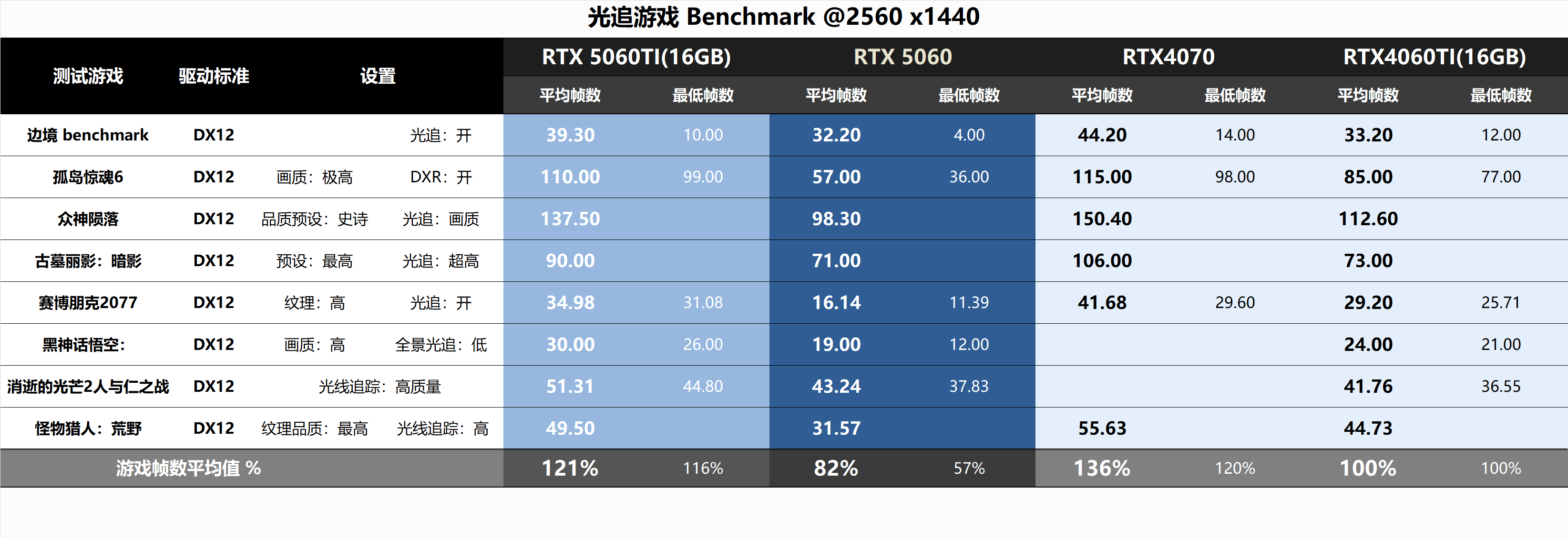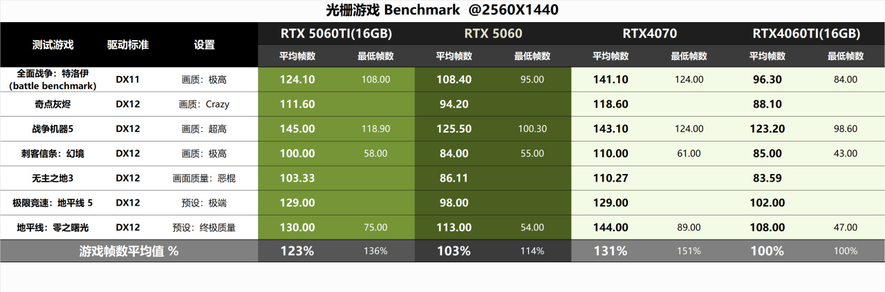 ▼1080分辨率和2k分辨率,RTX5060 領先RTX4060Ti 達到3%,落後RTX5060Ti ~20%。RTX4070在1080分辨率下稍稍受到平臺限制,和RTX5060的差距縮小了一點。