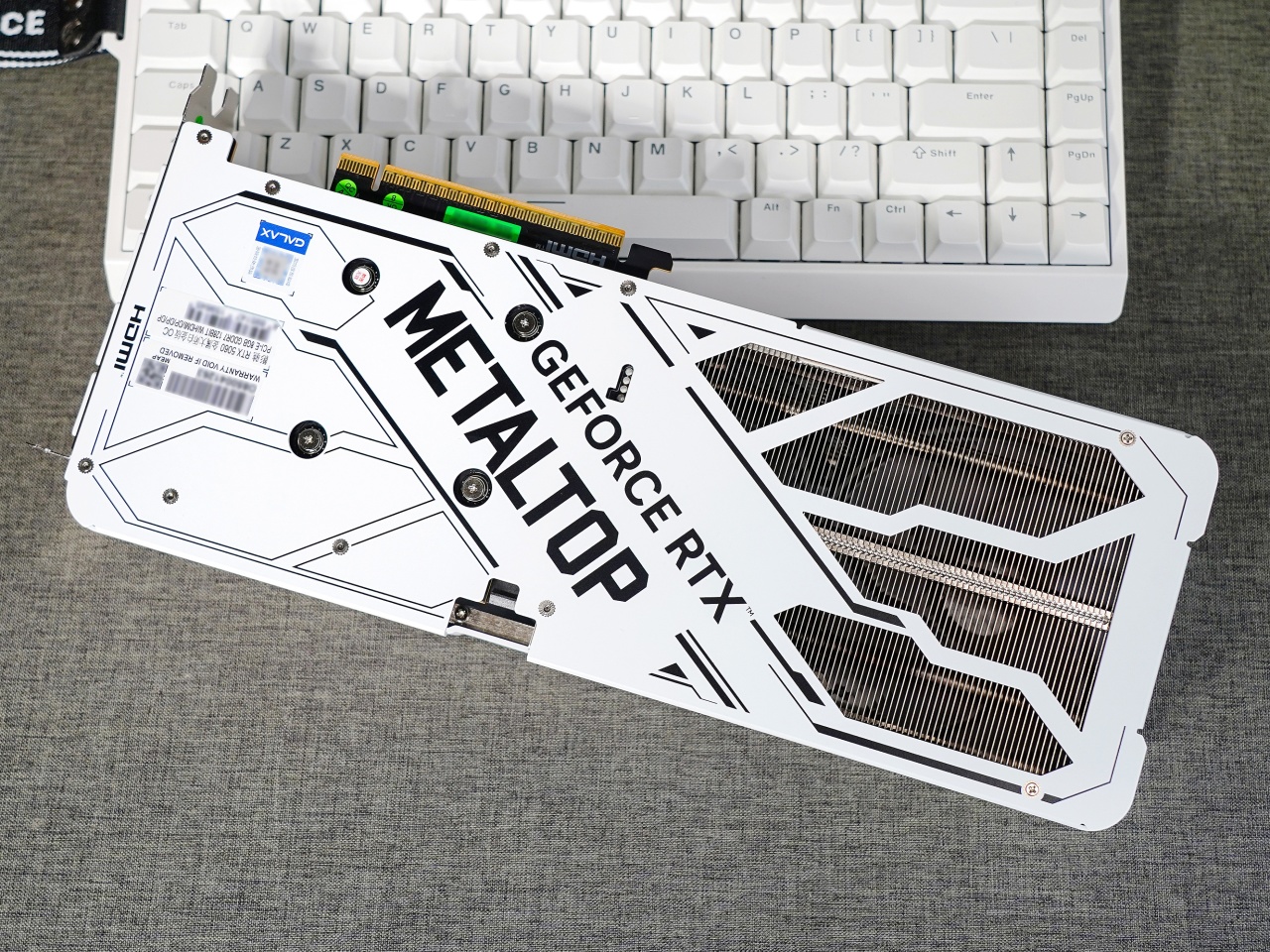 ▼顯卡的背板同樣是金屬材質,白色的底色,上面有黑色的METALTO標識及線條作爲裝飾。