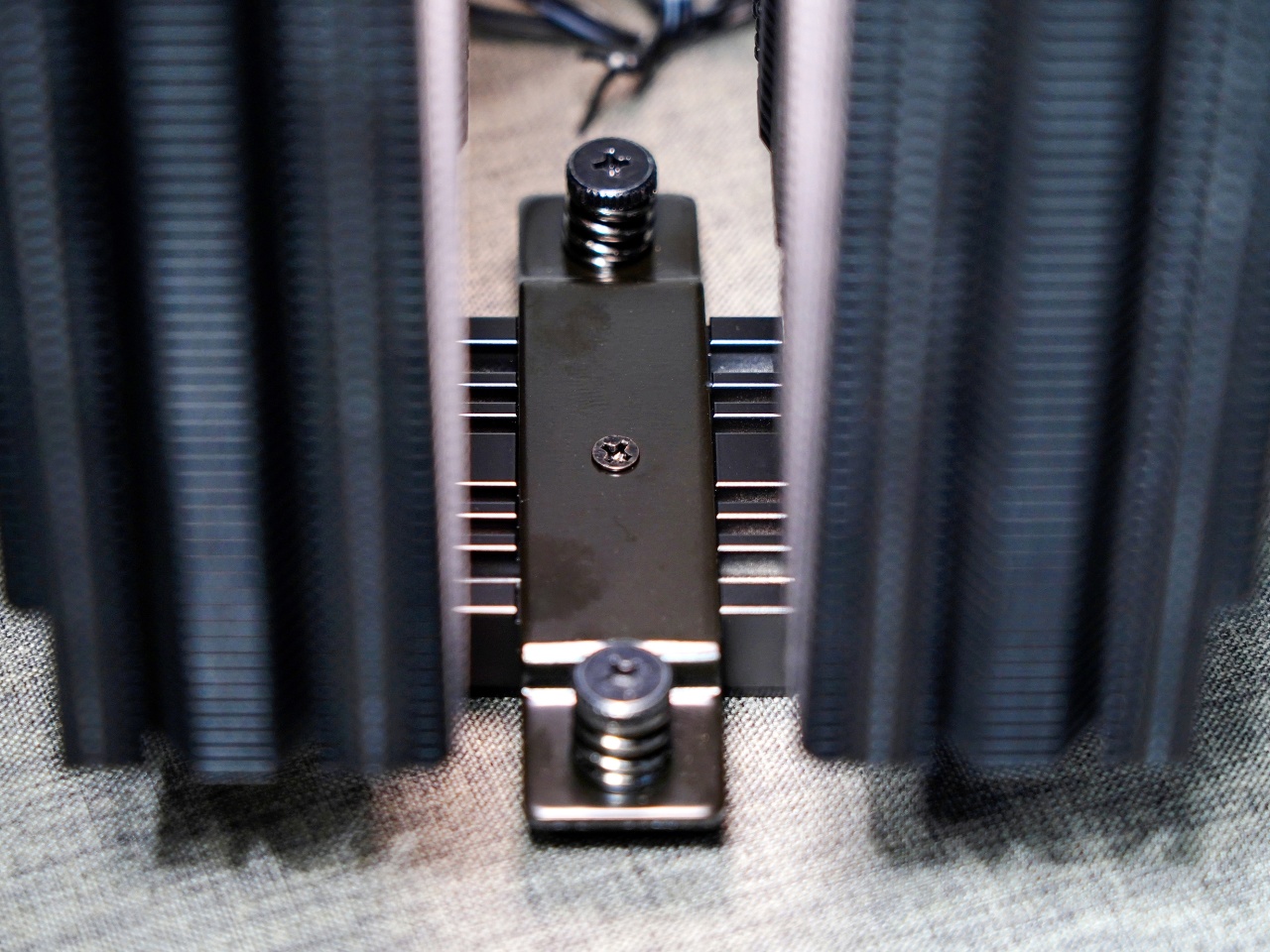 ▼和大部分雙塔散熱器的安裝方法差不多,也是需要拆下中間風扇,擰緊底座上的2個固定螺絲,再裝回風扇完成安裝。
