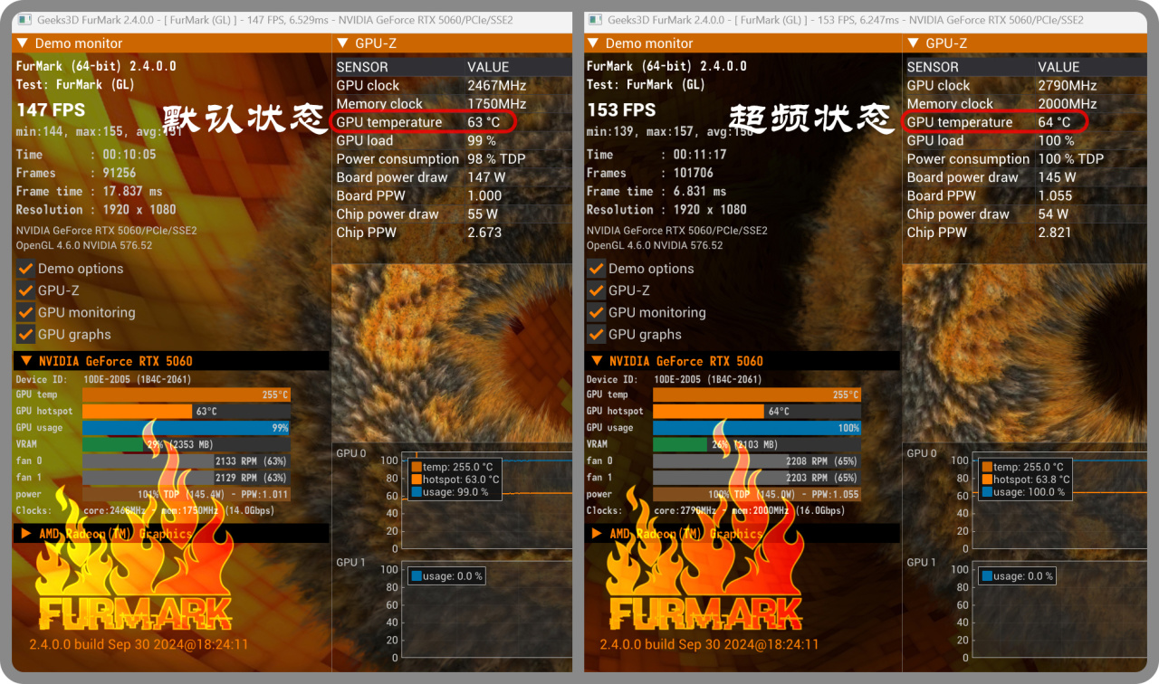 ▼Furmark烤機測試,參數設定爲1080p分辨率、0AA,10分鐘後,默認狀態溫度爲63℃;超頻狀態溫度爲64℃,溫度只高一度,可以說是誤差級別的,風扇轉速也只提高了一點點。金屬大師的散熱性能還是非常強大的。