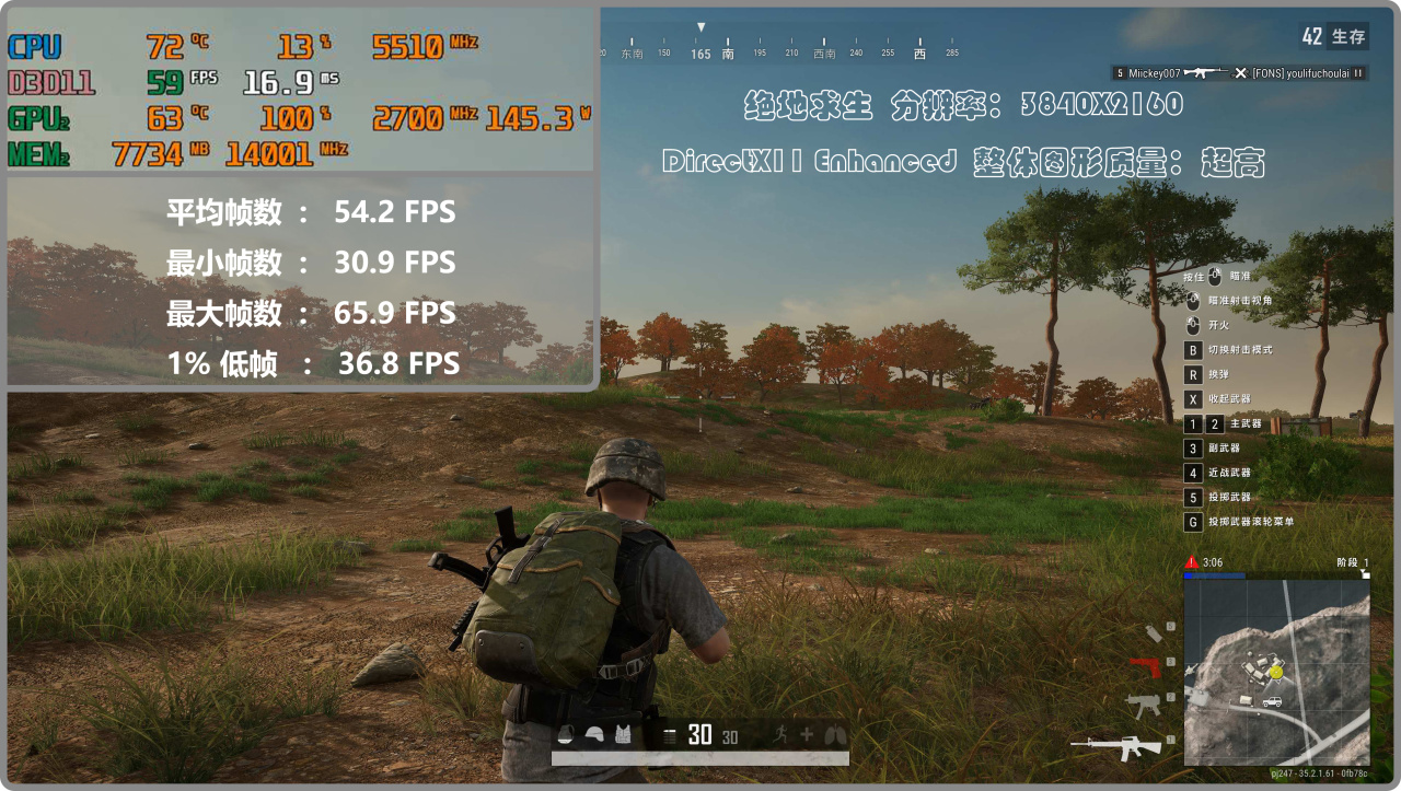 ▼4k分辨率,就有點喫不消了,平均幀數只有50+fps,但低幀會降到~30fps,影響遊戲體驗。當然如果進行一定的畫質優化設置,應該會好一些,達到勉強能玩的水平。