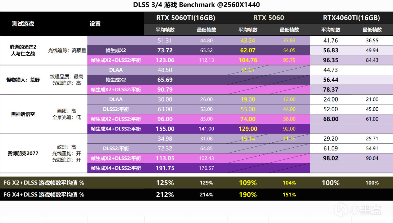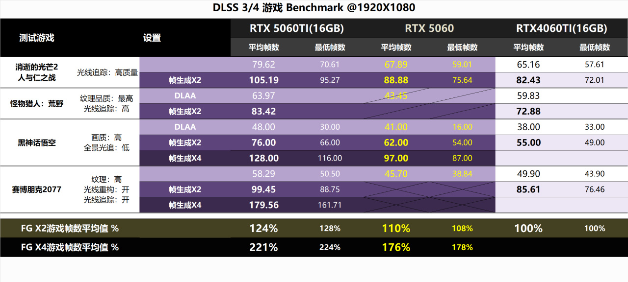 ▼DLSS 2超採樣在高分辨率下使用的效果更好,所以在1080p下可以使用幀生成來增加幀數。《怪物獵人》打開追光就被爆顯存了,它的數據沒意義了;《賽博朋克2077》開FG對於提升幀數是有效的,但benmark卻沒有記錄到FG的幀數,應該是個bug吧。所以RTX5060的實際對比數據也只有2款遊戲了。可以看到開啓FGX2後,領先RTX4060Ti 幅度達到了10%,《黑神話》開啓FGX4後都可以接近百幀了!