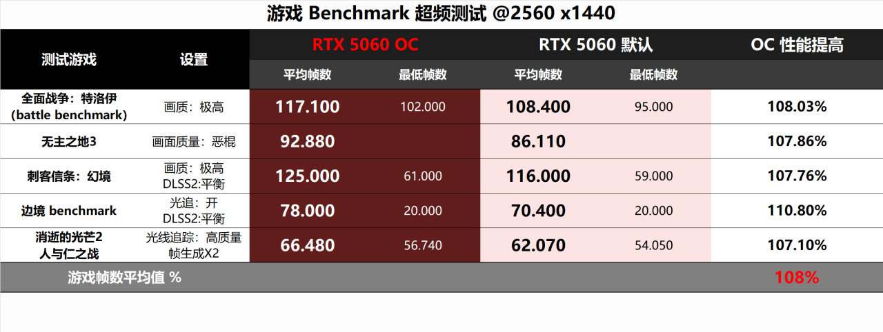 ▼再來看看實際的遊戲性能,2k分辨率,做了5款遊戲測試,平均下來超頻後性能提高了~8%,和其它更高型號的幾款RTX50顯卡超頻幅度基本一致。