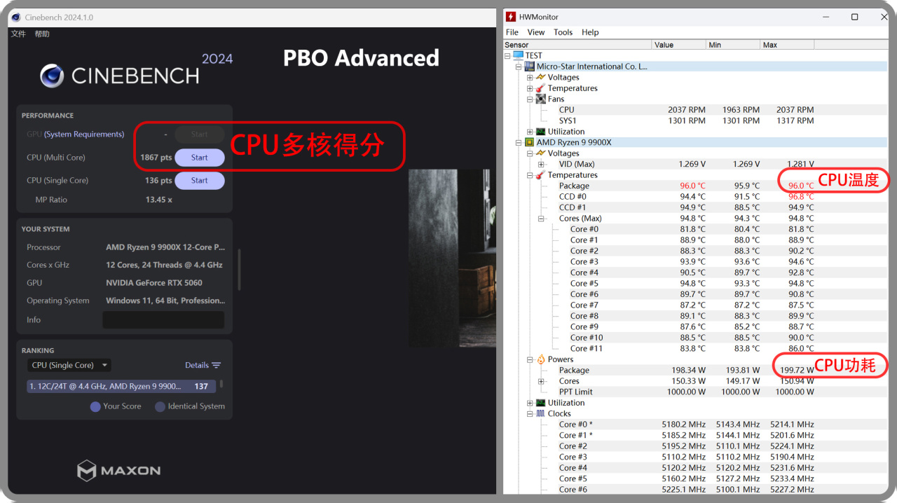 ▼PBO Advanced,頻率提升到最高,不設置溫度牆(默認爲95°C)。CPU最高溫度是96°C,功耗達到了200w。多核得分爲1867。觸碰到了溫度牆,稍微影響了超頻後的性能。之前使用360水冷,多核得分可以到1900左右,相當於使用風冷少了2~3%的超頻性能。