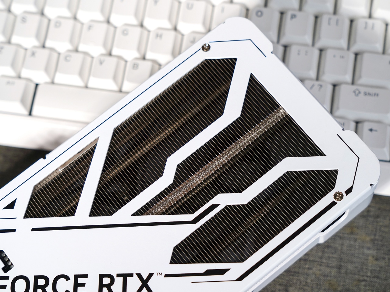 ▼白金版顯卡基本爲啞光質感的白色,有一些亮銀色的條紋作爲裝飾。整個風扇罩外殼採用一體壓鑄成型工藝的鋁合金材質,顯卡尺寸爲:304mm×123mm×44.5mm((不含擋板),和它大哥RTX5060Ti金屬大師是一樣的尺寸。