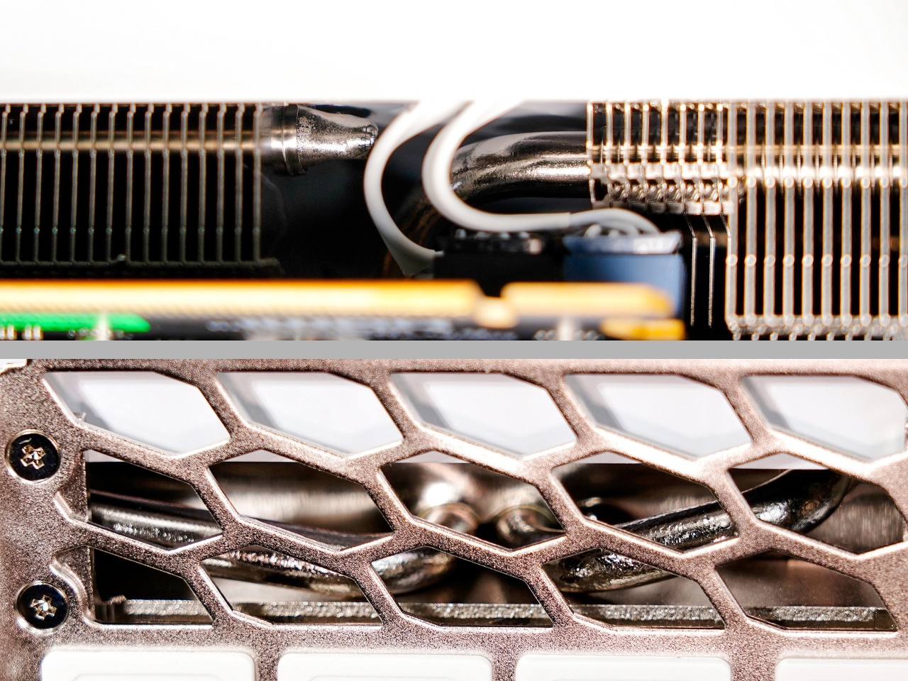 ▼顯卡前端並不是全封閉設計,中間有一個條形開口,露出3根Φ6mm鍍鎳複合熱管。