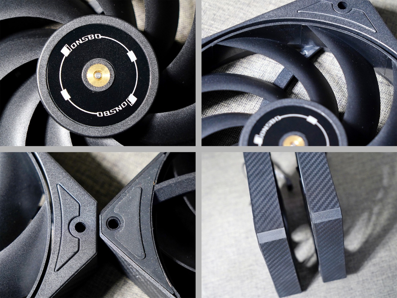 ▼扇葉爲9葉環形連葉形式,只有背面的四角有減震膠墊,風扇側面採用碳纖維的紋路作爲裝飾。