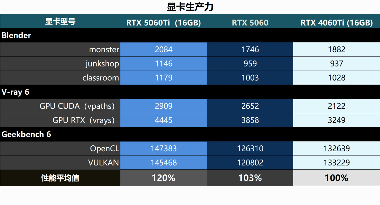 ▼RTX5060相比RTX5060Ti ,CUDA、TC和RT都少了~17%,功耗低了35w,其它參數則完全一致。因爲沒測過RTX4060,很遺憾沒有它的數據(也不想用別人的數據)。拉來RTX5060Ti、RTX4070和RTX4060Ti 一起作爲對比參考,也足夠能瞭解這張顯卡的性能了。