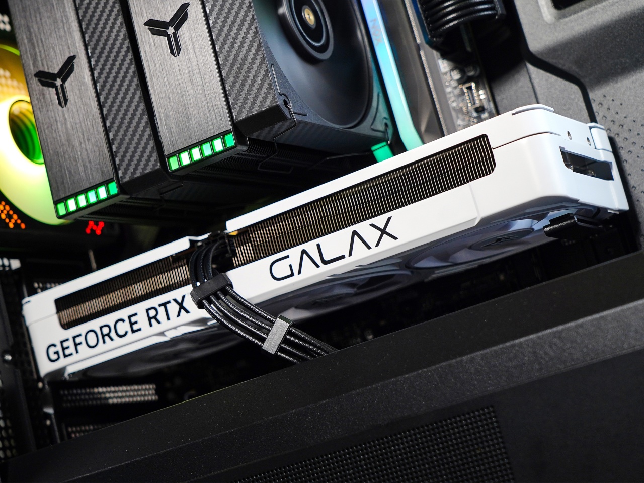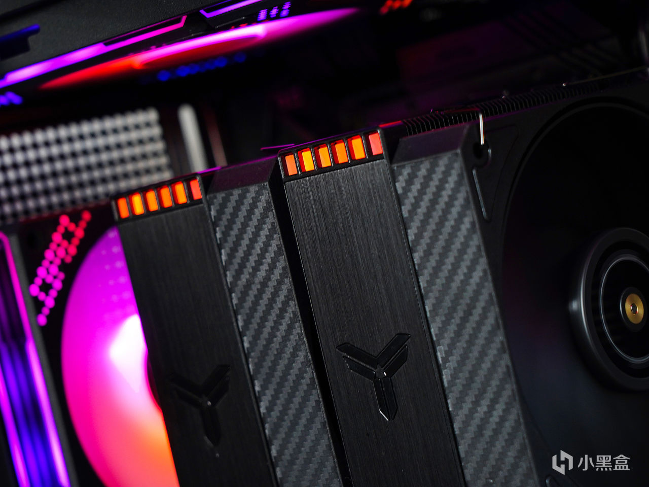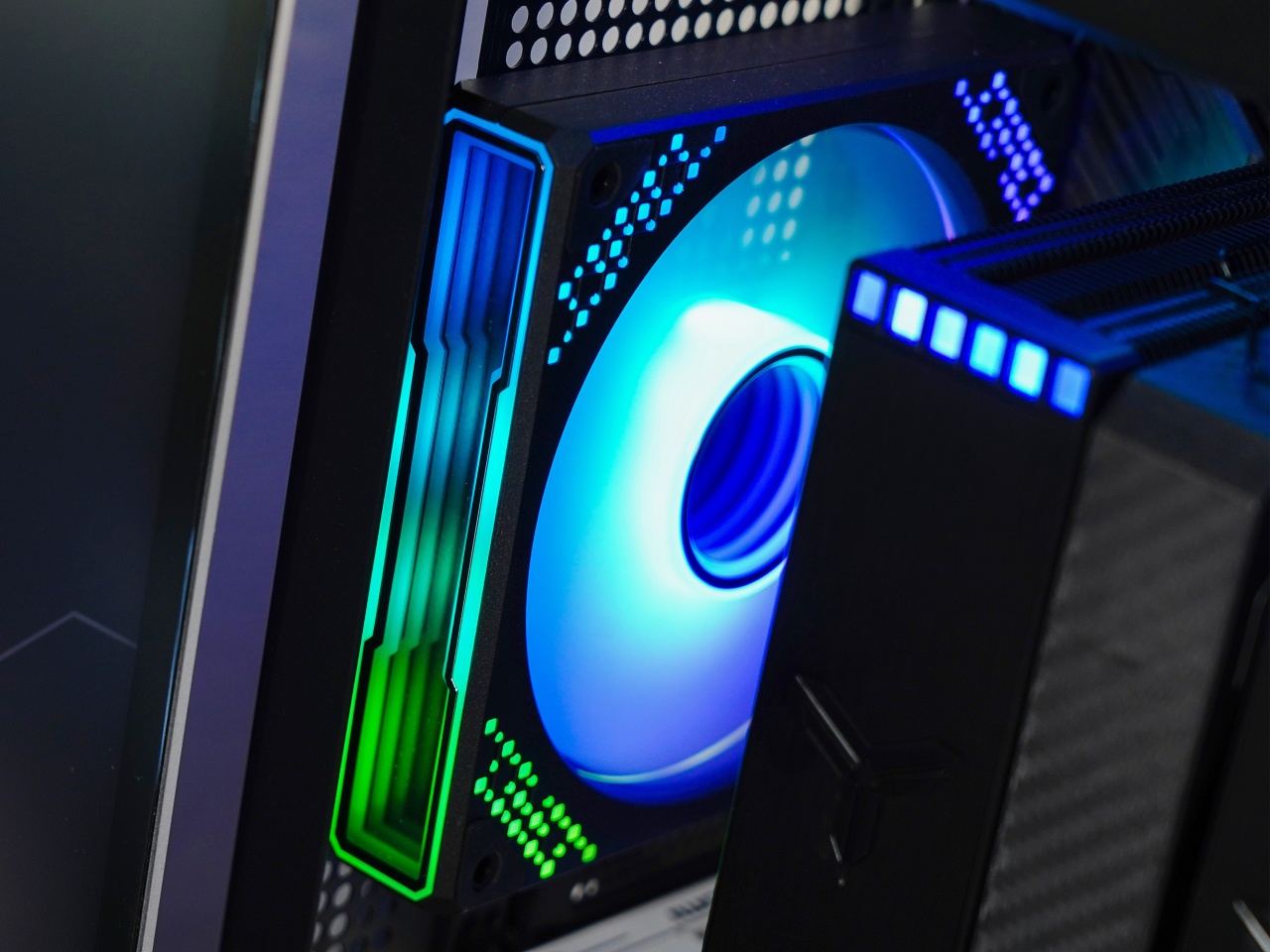 ▼但只能看到一條內存的光效了,內側內存基本被散熱器風扇遮擋住了。