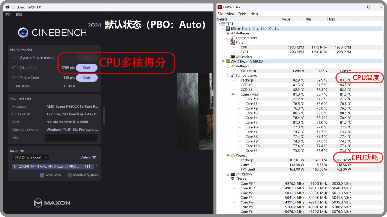 ▼首先來看下默認狀態。ADIA64 FPU烤機是一個傳統項目了,但9900X會降頻到4GHz左右,意義不大。所以使用行CPU負載較重的渲染測試CineBench R24(10分鐘)來作爲代替,這樣CPU能保持在~5GHz頻率,使用CPUID HWMonitor記錄到CPU(packagae)最高溫度爲83°C,最高功耗達到了162w。最後多核得分爲1769。