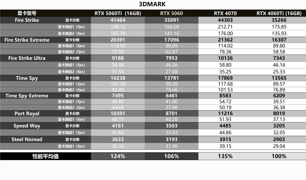 ▼3DMark的8項測試平均成績,以RTX4060Ti 爲100%基準,RTX5060領先了6%,落後RTX5060Ti 不到20%,但和RTX4070的差距比較大。