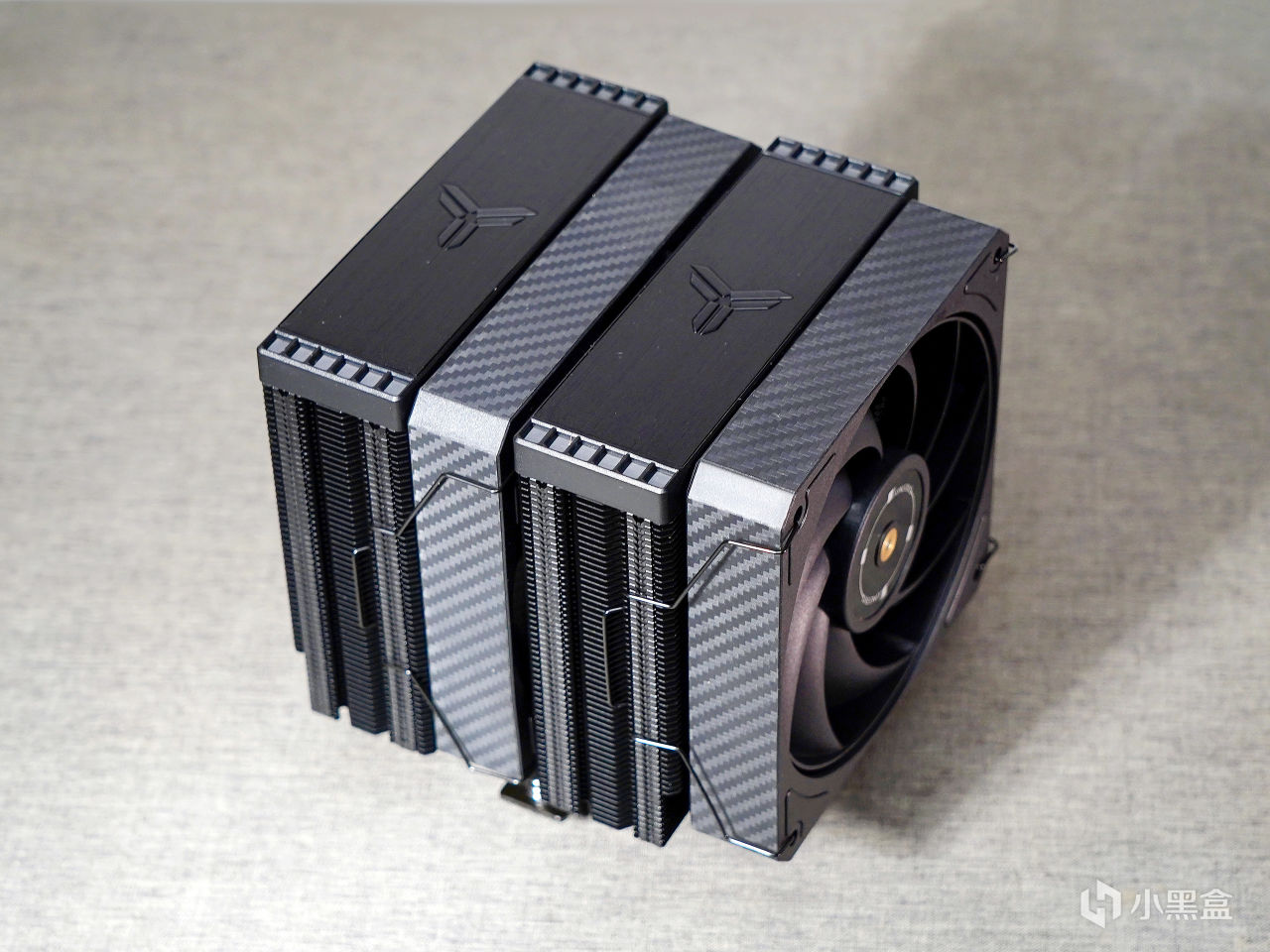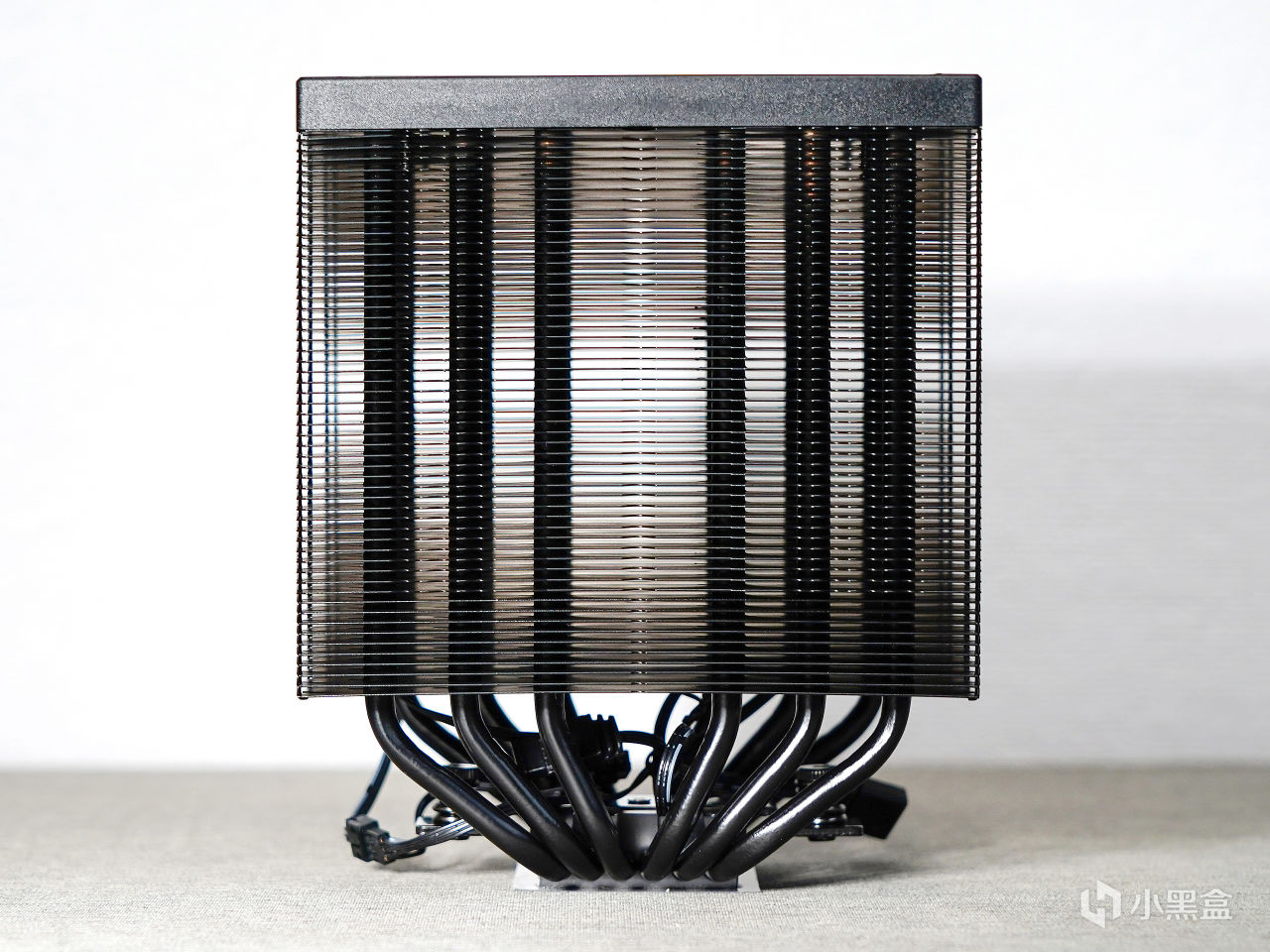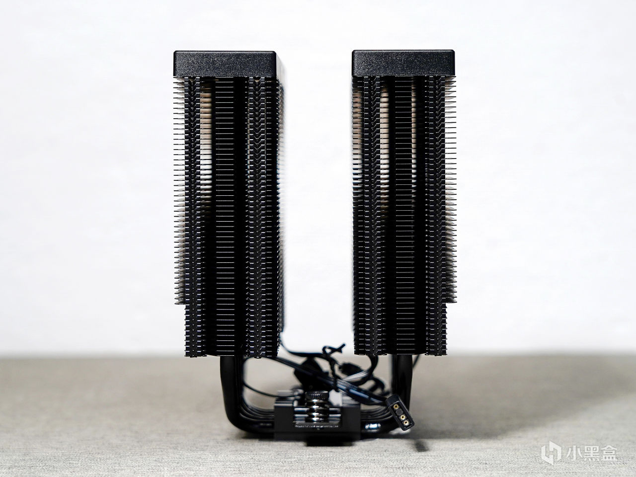 ▼這是一款雙塔的散熱器,採用了對稱結構設計,雙塔下邊都做了小幅度的避讓設計。採用了穿 Fin + 折 Fin 組合工藝,熱管和鰭片全部進行黑化噴塗。