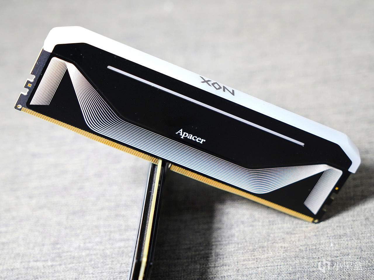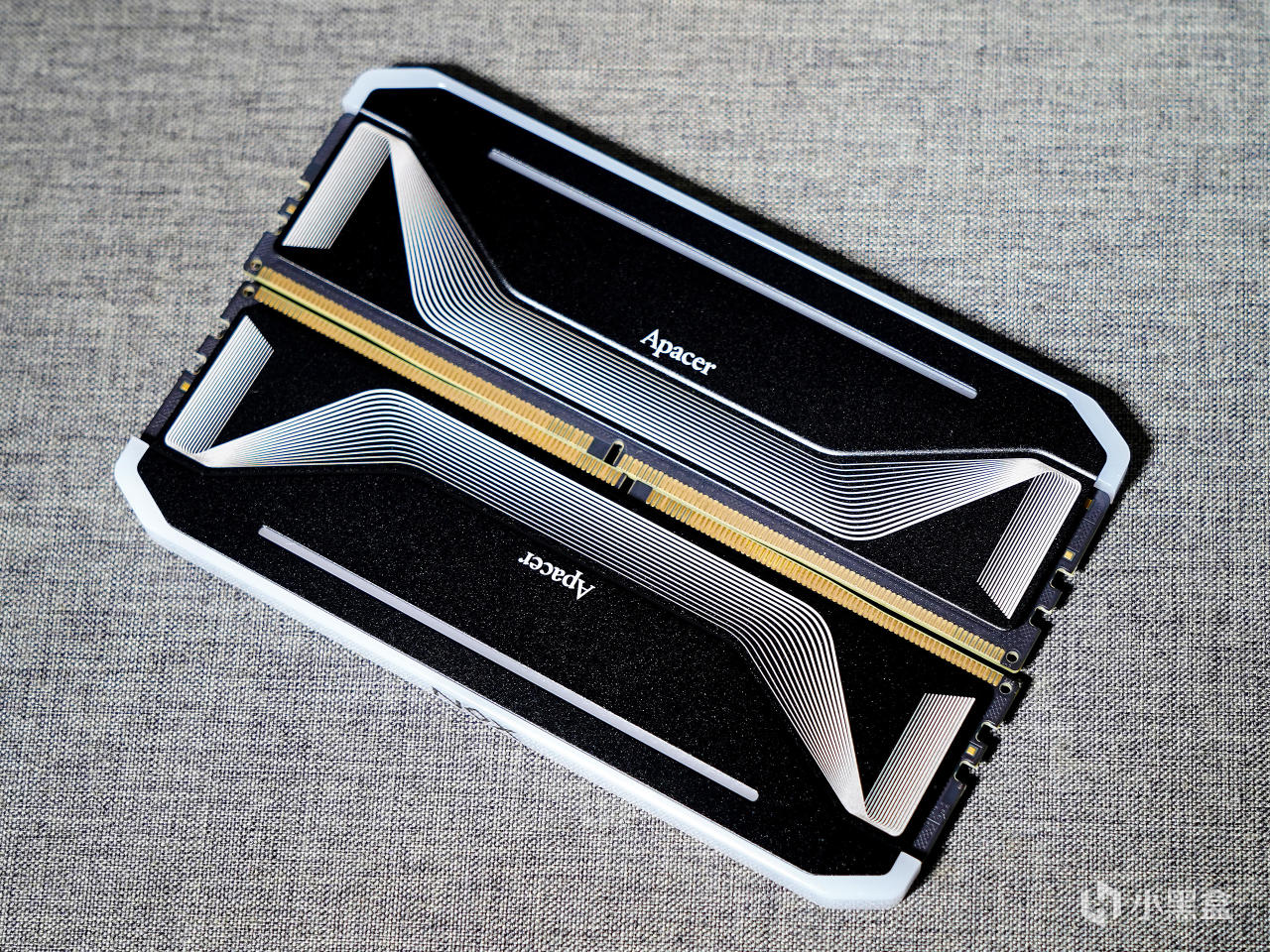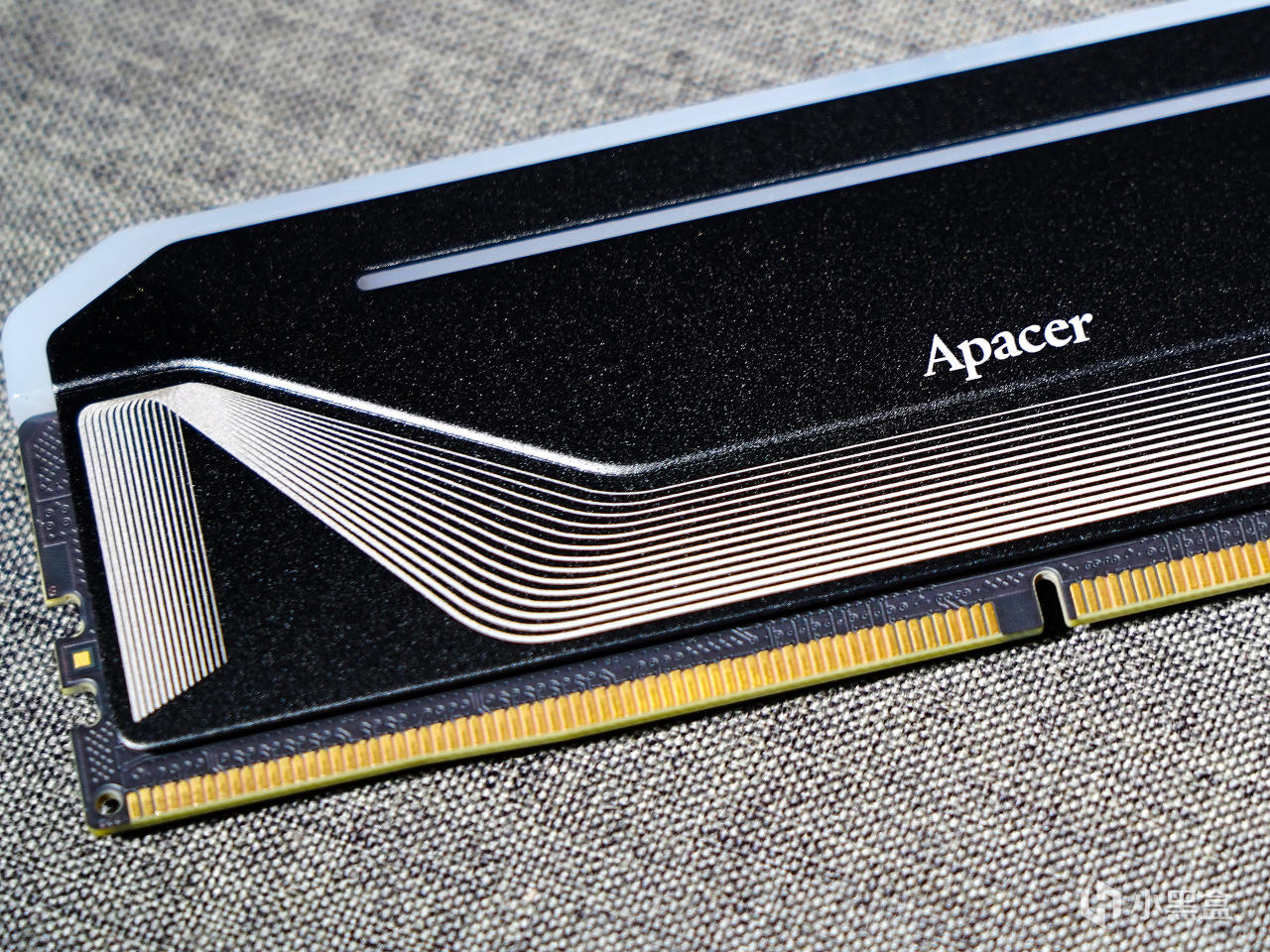 ▼馬甲分成高低兩層,這個落差非常小,起裝飾作用的。中間有Apacer的宇瞻英文logo標識,下層還有白色條紋作爲裝飾。靠上位置有一橫條開窗,內置導光條可以展示RGB燈效。