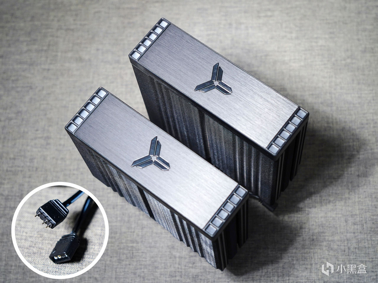 ▼頂蓋採用了鋁材質,並有拉絲質感,中心處有喬思伯的圖形logo,但並無光效,反而是兩端的格柵處有光效,供電採用了一公一母的ARGB接口。