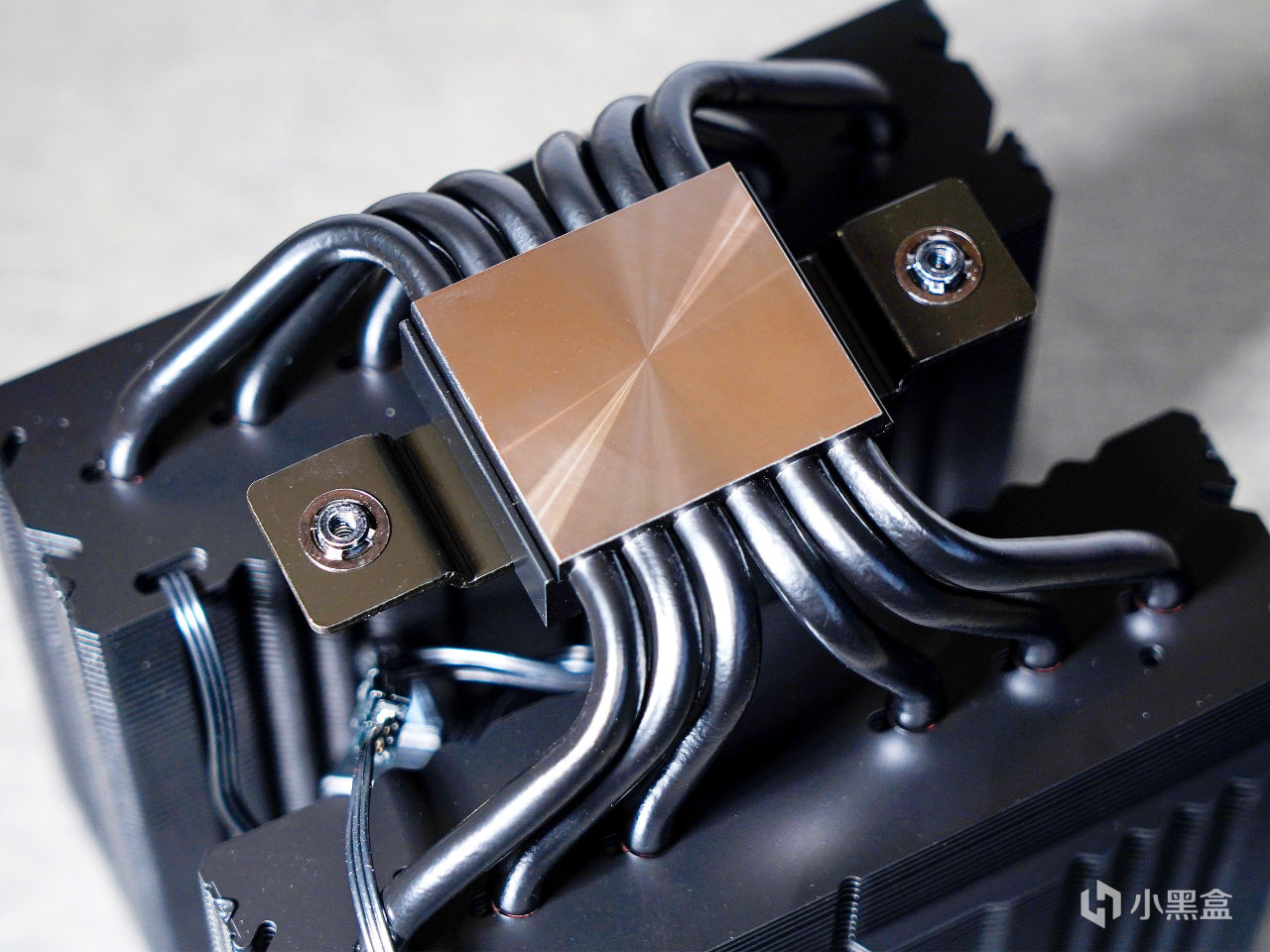 ▼散熱器採用了6根6mm的黑化“逆重力”熱管熱管,與底部的連接採用釺焊工藝,銅底表面鍍鎳,採用了CNC工藝,打磨出接近鏡面的效果。