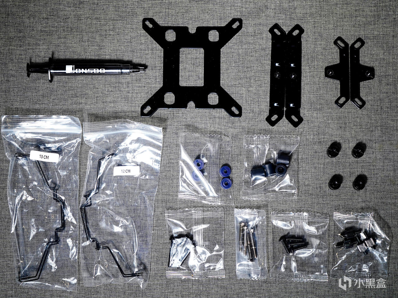 ▼配件如下圖所示,金屬材質的intel、AMD扣具和intel背板,以及各種螺柱、螺絲、固定風扇扣具、硅脂等。兼容平臺爲intel:LGA 115X/1200/1700/1851和AMD:AM4/AM5。