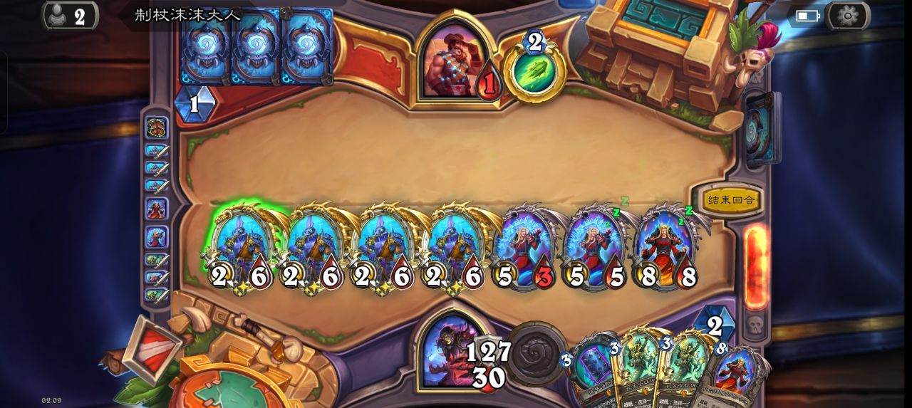 触发了的神铜须,身上有15费,并且手握血誓的战士就是无敌的,仅需三句话就可以劝退对手: