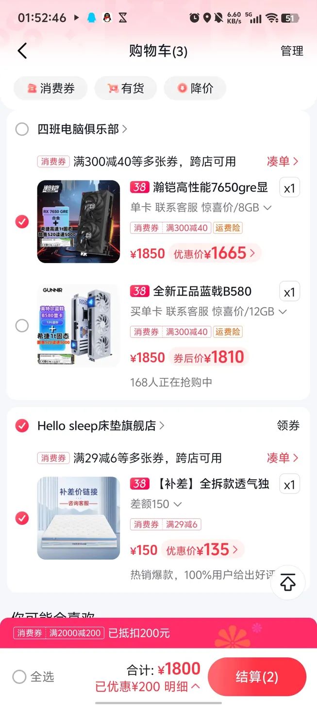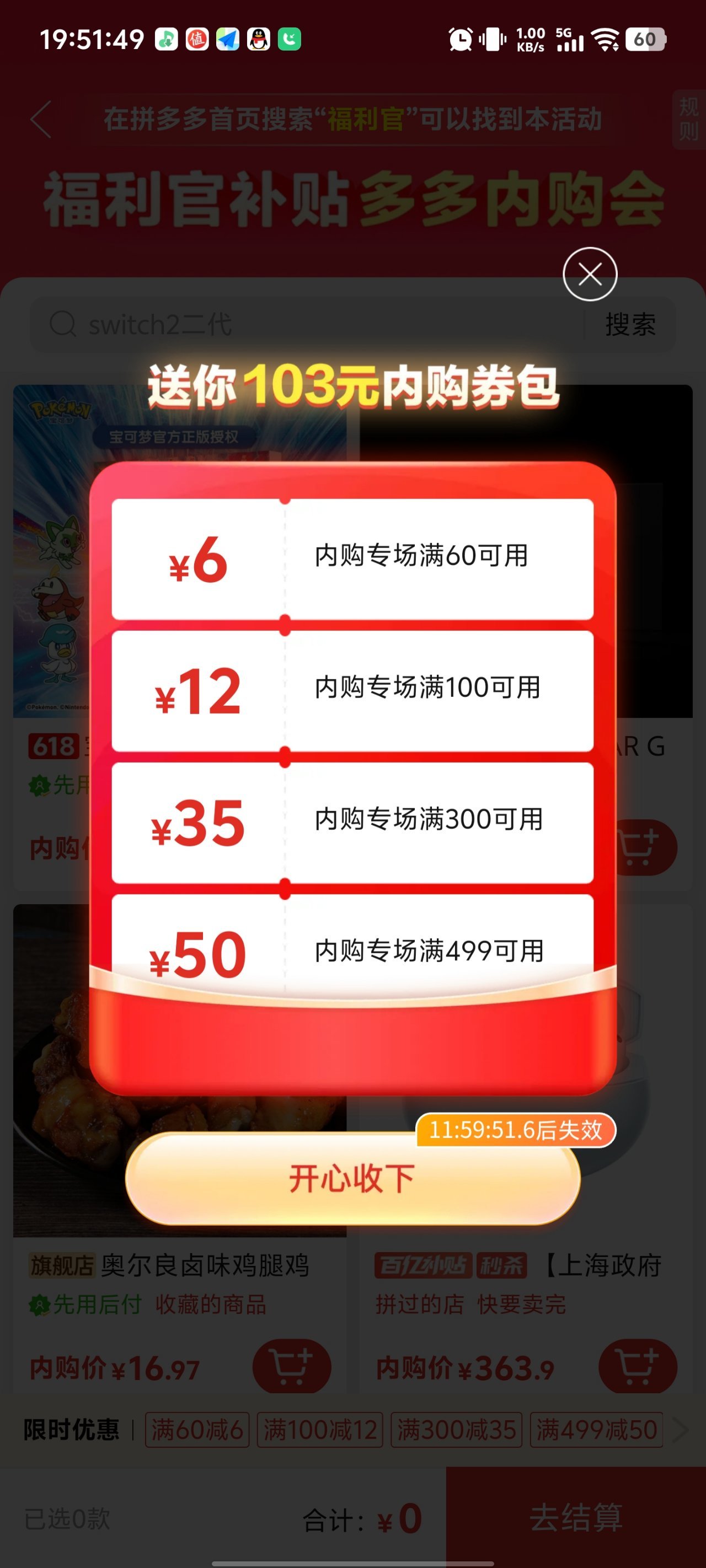 拼多多:搜索“内购会”,有四个金额的券,但没有特别大的,适合买内存条,风扇之类的便宜货。没事可以去多多果园浇水,虽然我没刷出过券就是了。有时候百亿补贴有奇价,但不稳定。建议收藏后等平台发券。(主打一个平常心,啥节日都不额外打折)