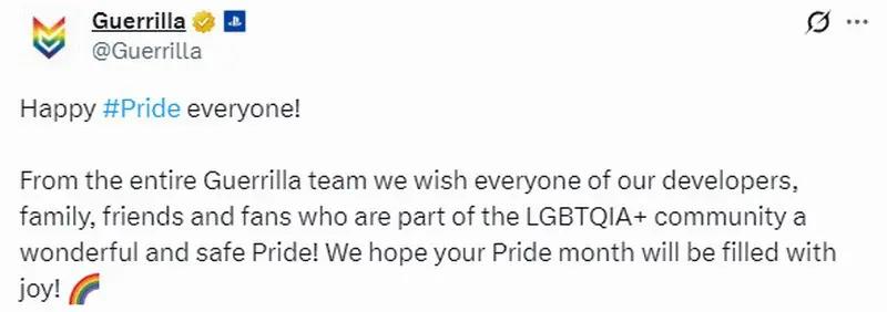 Guerrilla官方發推文稱:“Guerrilla團隊全體成員祝願所有的LGBTQIA+開發者、家人、朋友和粉絲們度過一個美好而安全的驕傲月!希望你們的驕傲月充滿喜悅”,官方還分享《地平線》女主埃洛伊的比心圖。
