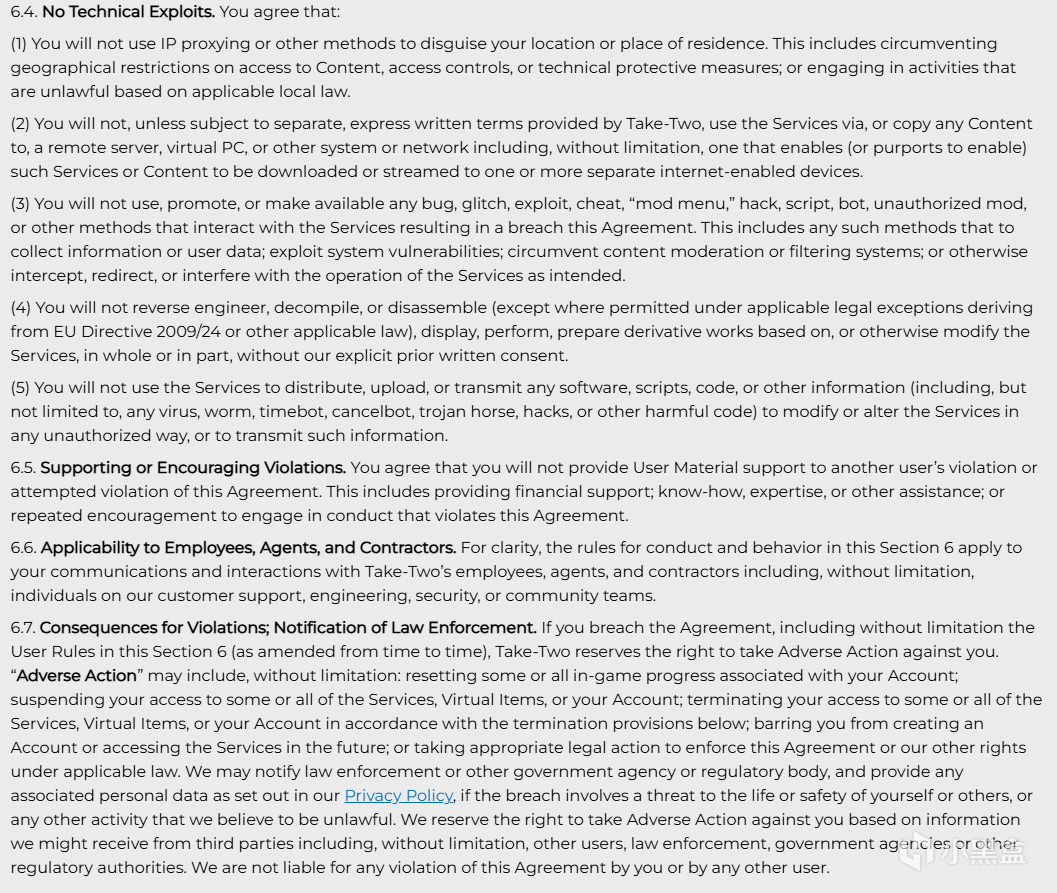 6.7. 違規後果;執法通知。如果您違反本協議,包括但不限於本第 6 節中的用戶規則(經不時修訂),Take-Two 保留對您採取不利行動的權利。“不利行動”可能包括但不限於:重置與您的帳戶相關的部分或全部遊戲內進度;暫停您對部分或全部服務、虛擬物品或您的帳戶的訪問;根據以下終止條款終止您對部分或全部服務、虛擬物品或您的帳戶的訪問;禁止您將來創建帳戶或訪問服務;或採取適當的法律行動來執行本協議或我們根據適用法律享有的其他權利。如果違規行爲涉及對您自己或他人的生命或安全構成威脅,或我們認爲非法的任何其他活動,我們可能會通知執法部門或其他政府機構或監管機構,並提供我們隱私政策中規定的任何相關個人數據。我們保留根據我們可能從第三方(包括但不限於其他用戶、執法部門、政府機構或其他監管機構)收到的信息對您採取不利行動的權利。對於您或任何其他用戶違反本協議的行爲,我們概不負責。