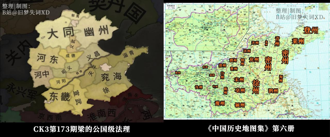 其次是梁,不難發現與歷史相比,河北西路、河北東路和京東西路做出了較爲明顯的改動。其中京東西路的改動最大,將歷史上淮南東路淮河以北的地區全歸其所有。