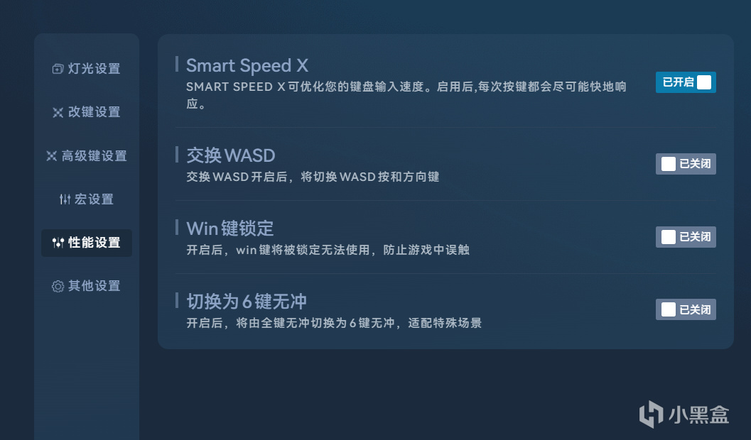 最后再聊聊ATK家这个驱动,个人认为这个驱动还是比较完善的, 网页版驱动和客户端驱动几乎没差 ,各种功能和设置该有的都有 界面也比较简洁美观 。唯一让我比较疑惑的是音乐律动灯效, ATK的驱动也只有客户端才支持 。另外 ,驱动里还可以开启SmartSpeed模式 ,官方宣称开启后延迟最低可以低至1ms ,这个技术应该对打游戏很有帮助 ,不过需要说明的是这个模式默认是关闭状态 ,所以我猜测开启后应该还是会对续航有一定的影响。