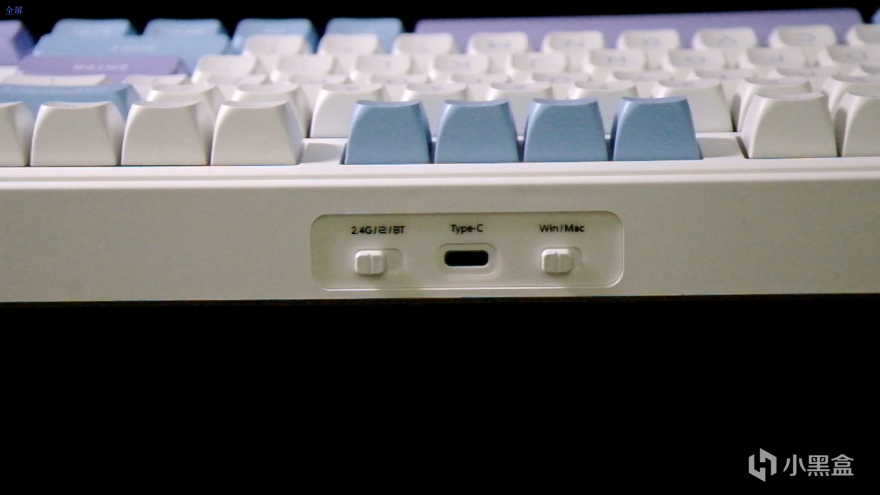 键盘右侧有一个大小写指示灯, 顶部则是一个Type C 充电口和两个用来进行模式切换的拨动开关, 键盘背面也很平平无奇 ,两段式脚撑和隐藏式接收器收纳仓 ,现在都已经很常见, 最后需要注意的是A87的外壳是塑料材质 键盘的质感比较一般。