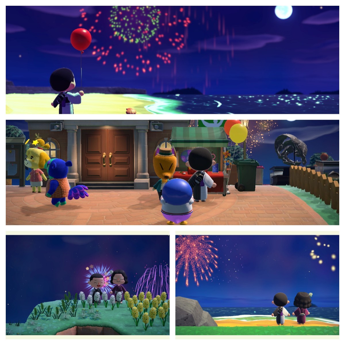 那个夜晚,小岛上也有了各种活动和售卖,一群小动物在一起很热闹,我也特意给闺女和自己在游戏里买了身和服,手拿着气球,一起看着绚烂的烟花。
