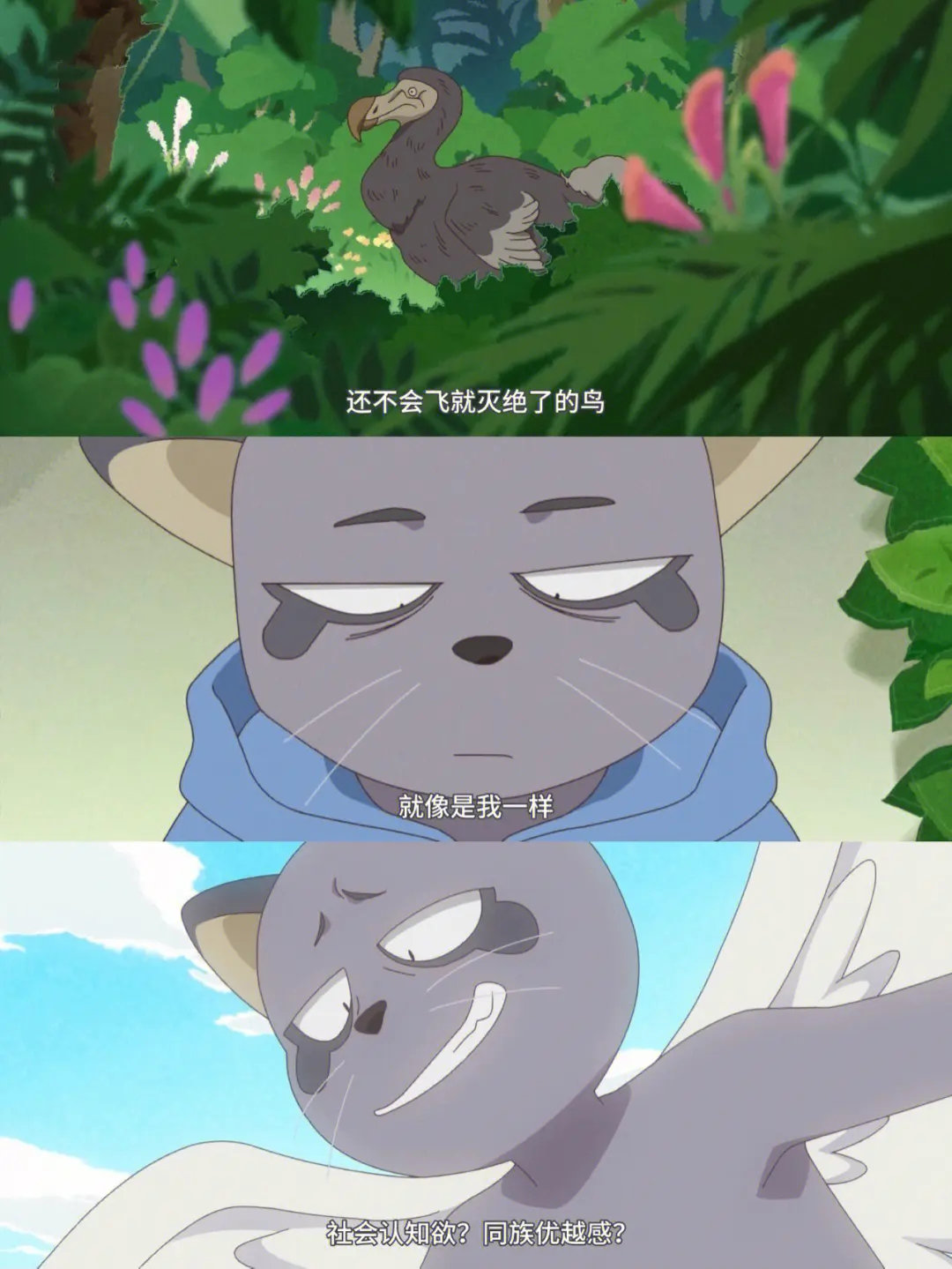 相比之下,《奇巧》的主創們就明智得多。他們深知"要想獲得什麼,必先捨棄什麼"的道理。在有限的時間和資源下,他們選擇將重心放在劇本和人物塑造上,而在作畫和演出上則相對節制。爲了減輕製作壓力,他們採用了相對簡單的動物人設,並大量運用獨白和對話來推進劇情(這恰好是此元和津也的拿手好戲)。然而,即便是簡單的人設,《奇巧》的主創們也並未敷衍了事。他們用心地將角色、背景、演出融爲一體,打造出了一種獨特的藝術風格。反倒是那些看似簡陋的動物形象,成爲了這部作品的一大亮點,爲整部動畫增色不少。