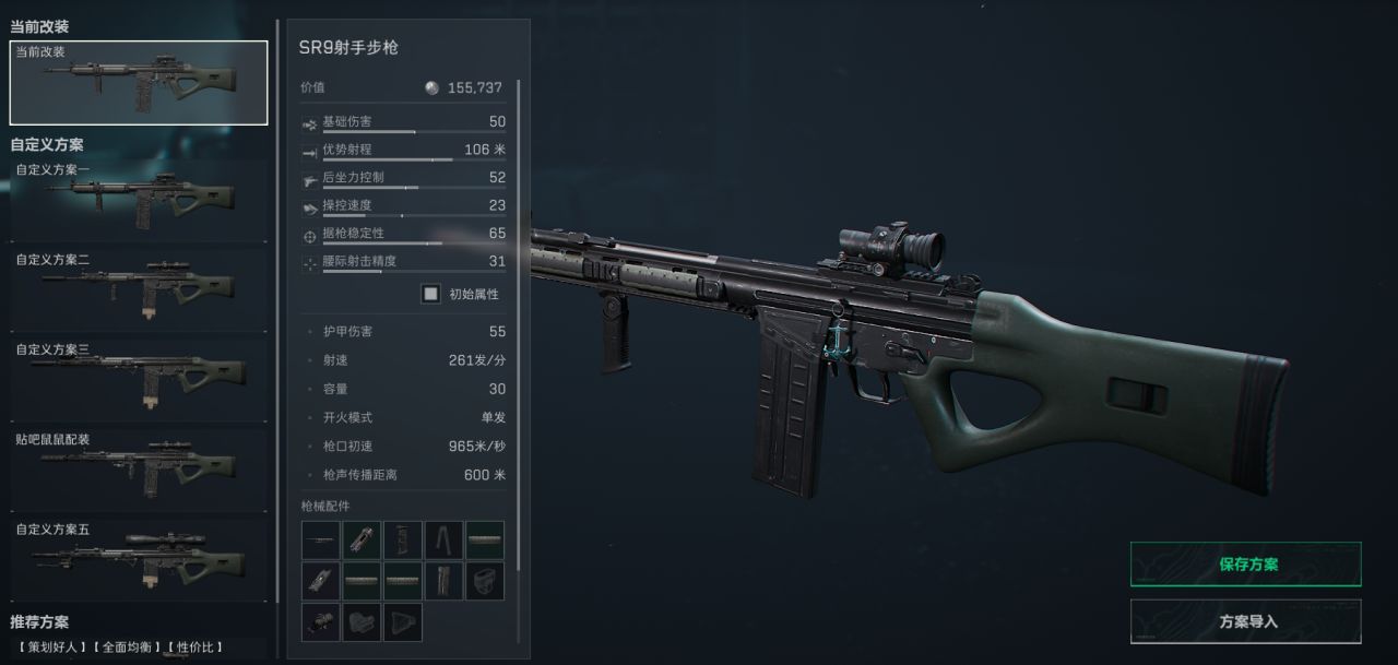最便宜的射手步槍僅需一萬一把槍身,但是對應的是這把槍的基礎屬性極差而且因爲配件較少不能加裝槍托的緣故導致擴展性也不怎麼樣(除非加裝神射手槍管)不過優點是他的絕大多數配件都是和g3通用的而且打的是7.62×51的大口徑子彈。m而且本身槍口初速不錯,在沒有改裝的情況下就足足有750的槍口初速,在花15w的窮鬼改裝後有着足足有接近一千米的初速用來打狙是完全足夠了。