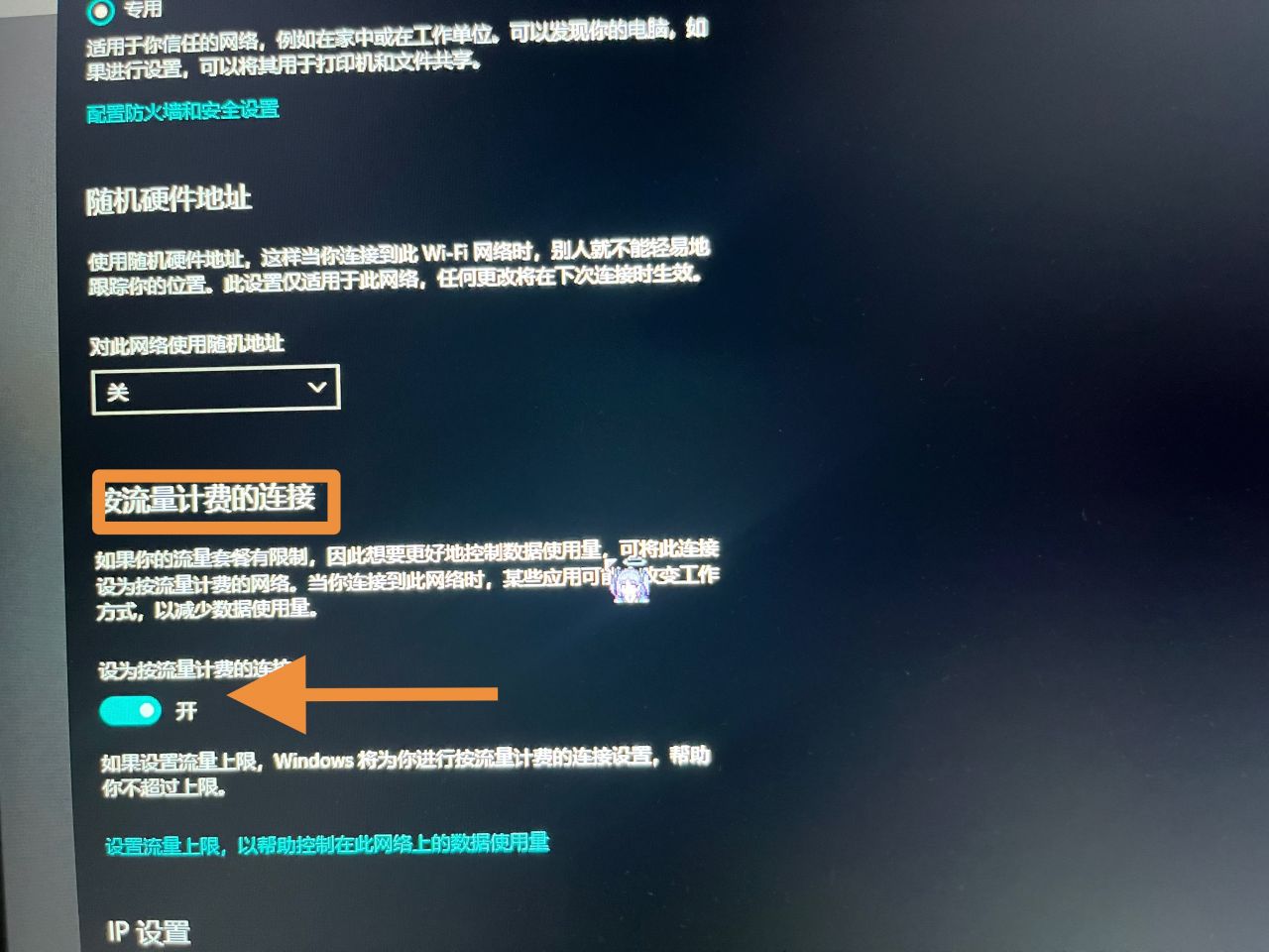 3.找到“按流量计费的连接”并开启“设为按流量计费的连接”