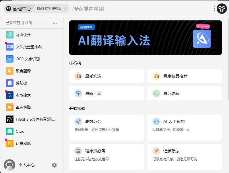 Utool :知名瑞士軍刀,具有豐富的插件,最喜歡的是可以根據複製的文字或圖片類型快速適配對應的插件,如截圖後喚出,推薦使用OCR等。甚至有很多適合辦公的插件,如主包是程序員,一些加解密、格式化都會用它的ctool插件。最推薦應用之一,單開一篇也不爲過。